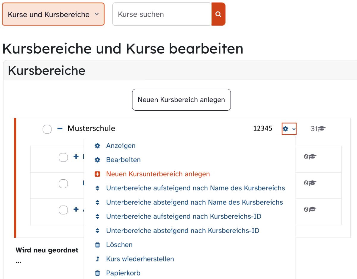 Ebenfalls ist es möglich über das Zahnrad bei Ihrer Schule einen neuen Kursbereich anzulegen, auf unterschiedliche Weise bestehende Kurse zu sortieren (z. B. aufsteigend, absteigend, nach Kursbereichsname oder Kursbereichs-ID), zu löschen oder wiederherzustellen.