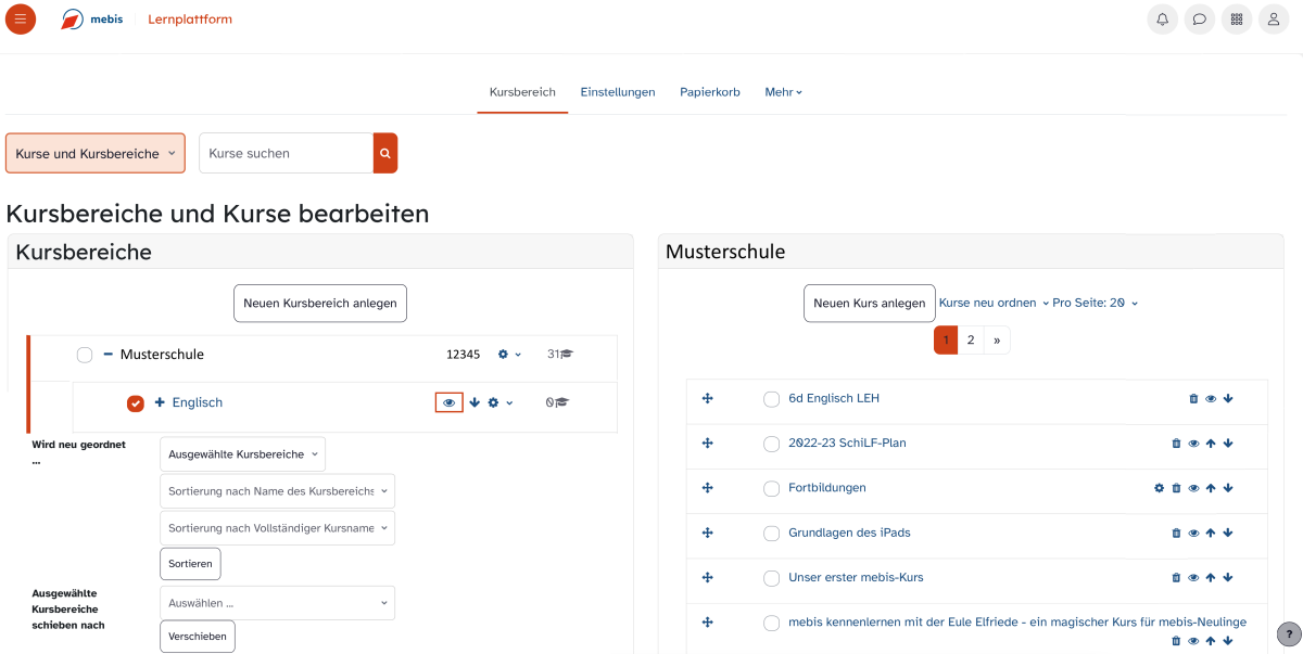 Jedem Kursbereich ist das Symbol Auge zugeordnet, das sich ein- oder ausschalten lässt. Hiermit machen Sie Kursbereiche für alle Lehrkräfte und Lernenden unsichtbar oder sichtbar.