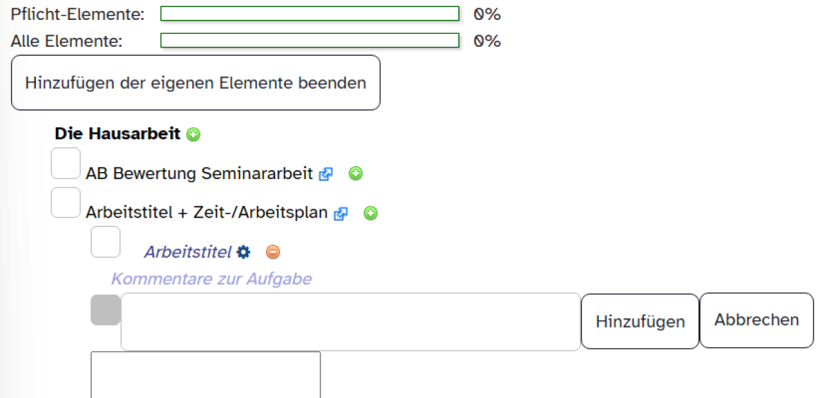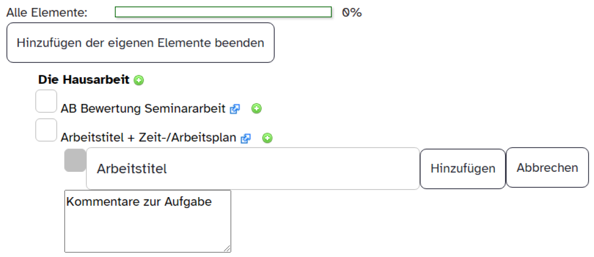Wenn Ihnen eine Checkliste in einem Kursraum zur Verfügung gestellt wurde und Sie diese um weitere Einträge ergänzen möchten, dann sollten Sie zunächst prüfen, ob dies bei der eingestellten Checkliste möglich ist. Klicken Sie dazu im Kursraum auf die Beschriftung der Checkliste, um zur Detailansicht zu gelangen. Hier werden die zu bearbeitenden Aufgaben und der bisherige Bearbeitungsstand angezeigt. Sehen Sie darüber hinaus den Button Eigene Elemente hinzufügen, dann können Sie die Checkliste individuell erweitern. Klicken auf diesen Button, dann erscheinen sowohl neben den Abschnittsüberschriften aus dem Kursraum (hier: Die Hausarbeit) als auch neben den bereits eingestellten Aufgaben Plus-Symbole. Klicken Sie auf das Symbol neben der Abschnittsüberschrift, um eine eigene neue Aufgabe anzulegen. Alternativ dazu können Sie aber auch eine vorhandene Aufgabe in mehrere untergeordnete Aufgaben gliedern, indem Sie auf das Plus-Symbol neben einer bereits eingestellten Aufgabe klicken.