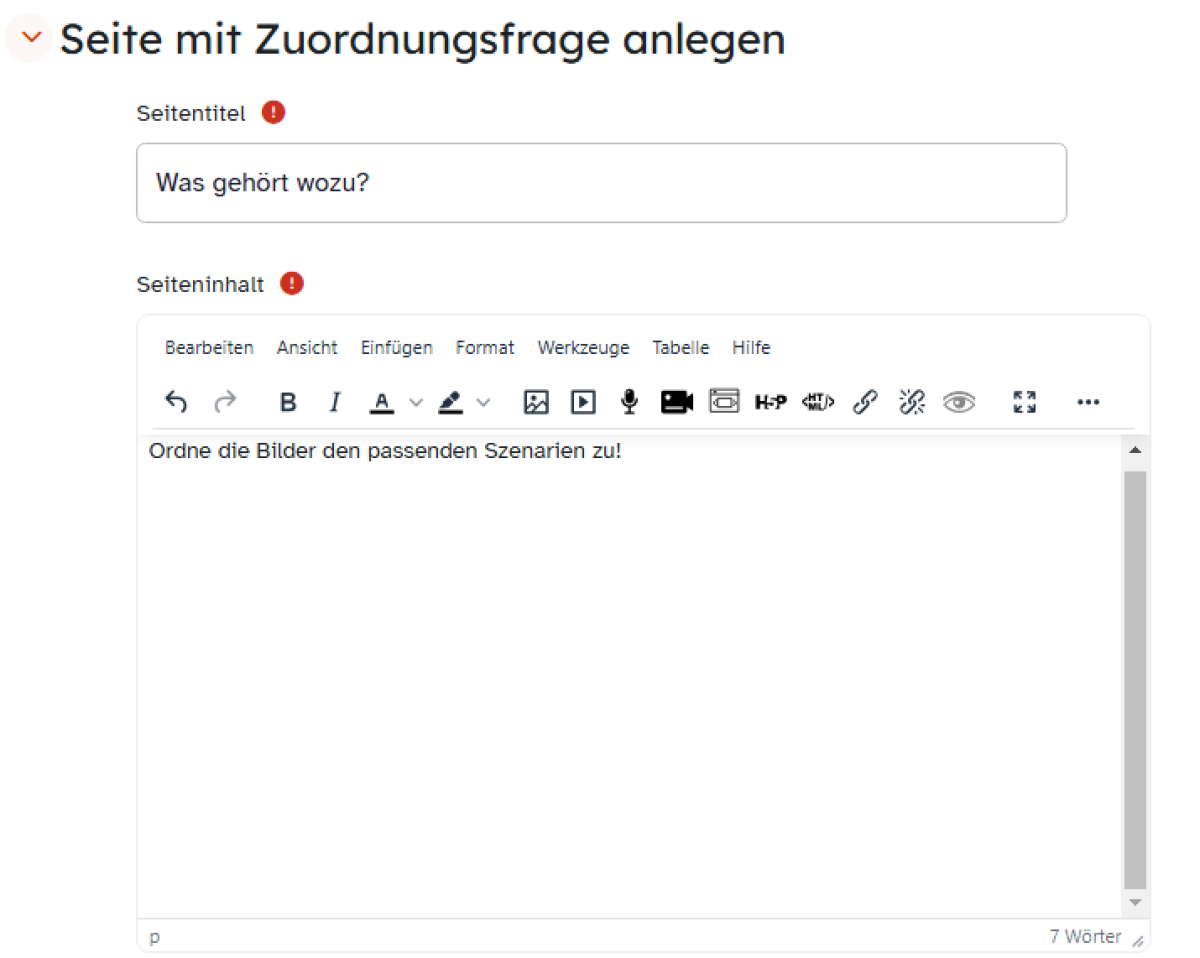 Geben Sie nun der Frageseite einen prägnanten Seitentitel und erklären Sie im Texteditorfeld als Seiteninhalt, was konkret von den Nutzerinnen und Nutzern verlangt wird.