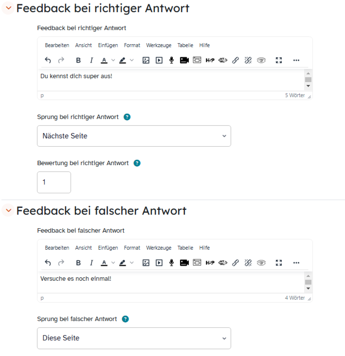 Im Abschnitt Feedback bei richtiger Antwort können Sie ein Feedback formulieren, das erscheint, wenn eine korrekte Zuordnung vorgenommen wird.