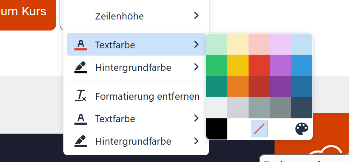 Die gewählte Textfarbe oder Hintergrundfarbe entfernen Sie, indem Sie erneut die Textstelle markieren und Sie unter Format und Textfarbe (oder Hintergrundfarbe) das Löschen-Symbol in Form eines schräg liegenden Strichs wählen. Die zuvor gewählte Formatierung wird dadurch entfernt.
