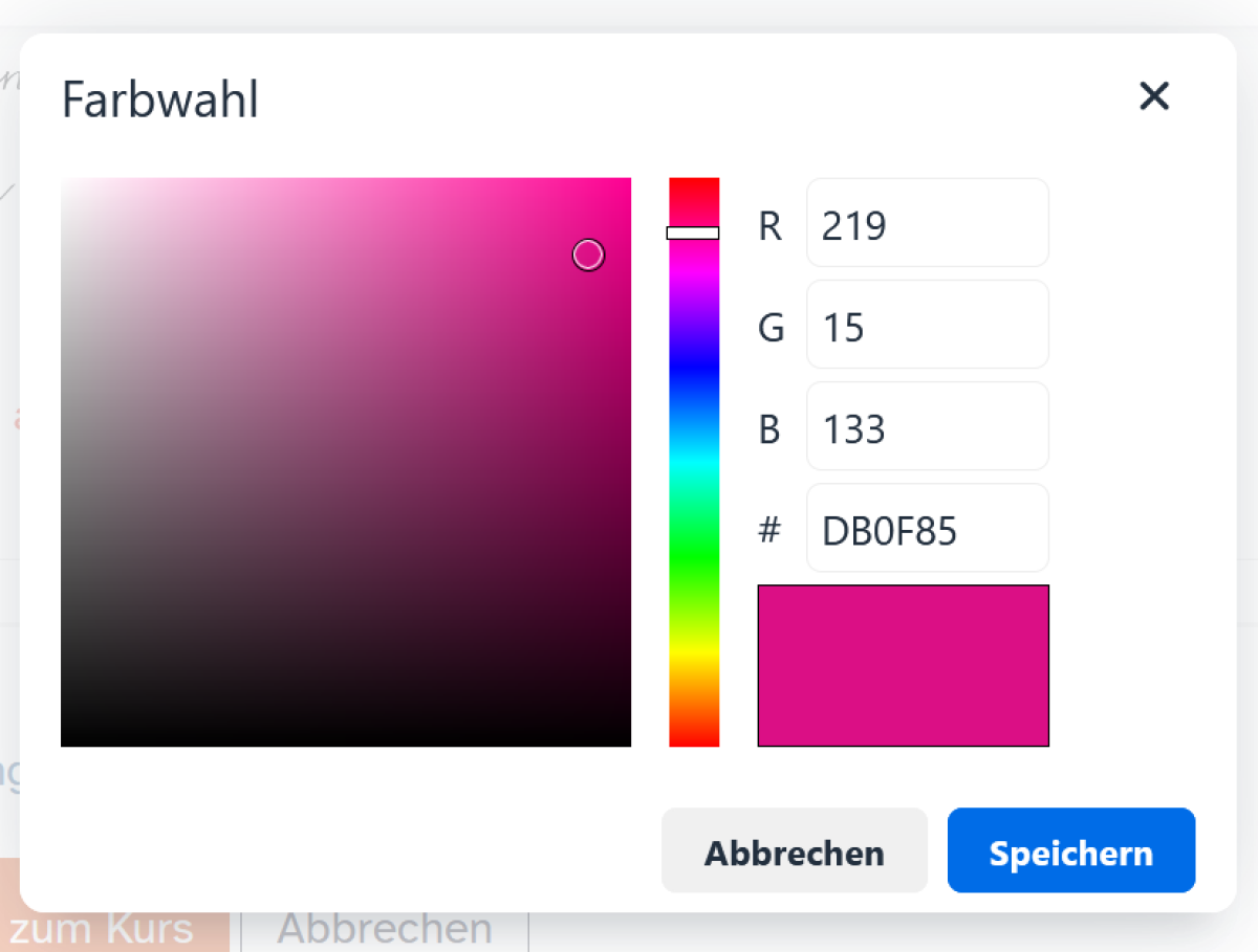 Im rechten Bereich sehen Sie eine Vorschau und die Informationen zur Farbe (z.B. den HEX - Code). Sie können diesen Code auch an anderen Stellen verwenden und stellen damit sicher, dass Sie immer dieselbe Farbe verwenden.