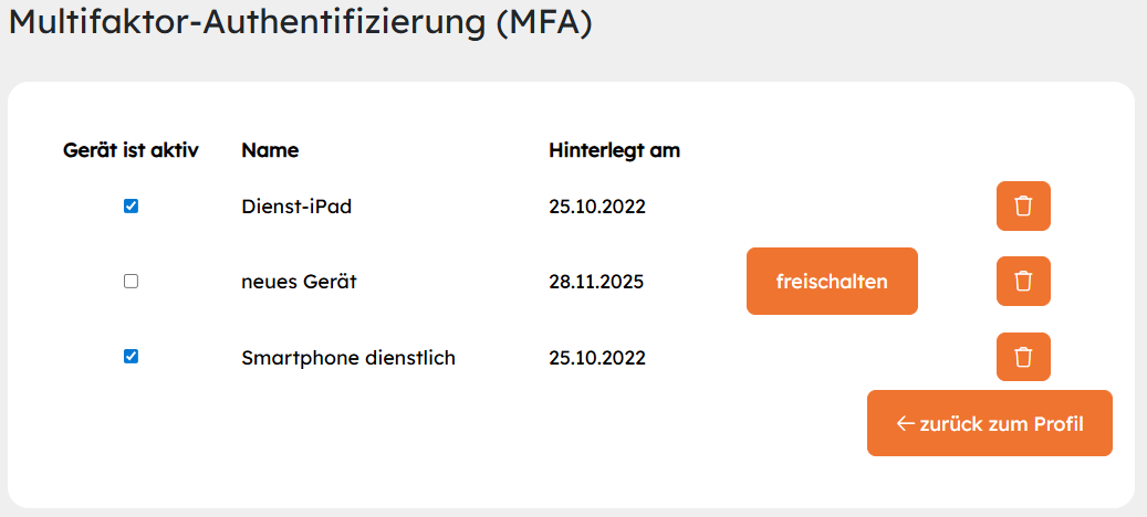 Hat die Lehrkraft ein MFA-Gerät nachregistriert, dann wird dieses als inaktives Gerät angezeigt. Um es freizuschalten, klicken Sie zunächst auf die Checkbox neben dem entsprechenden Gerät.