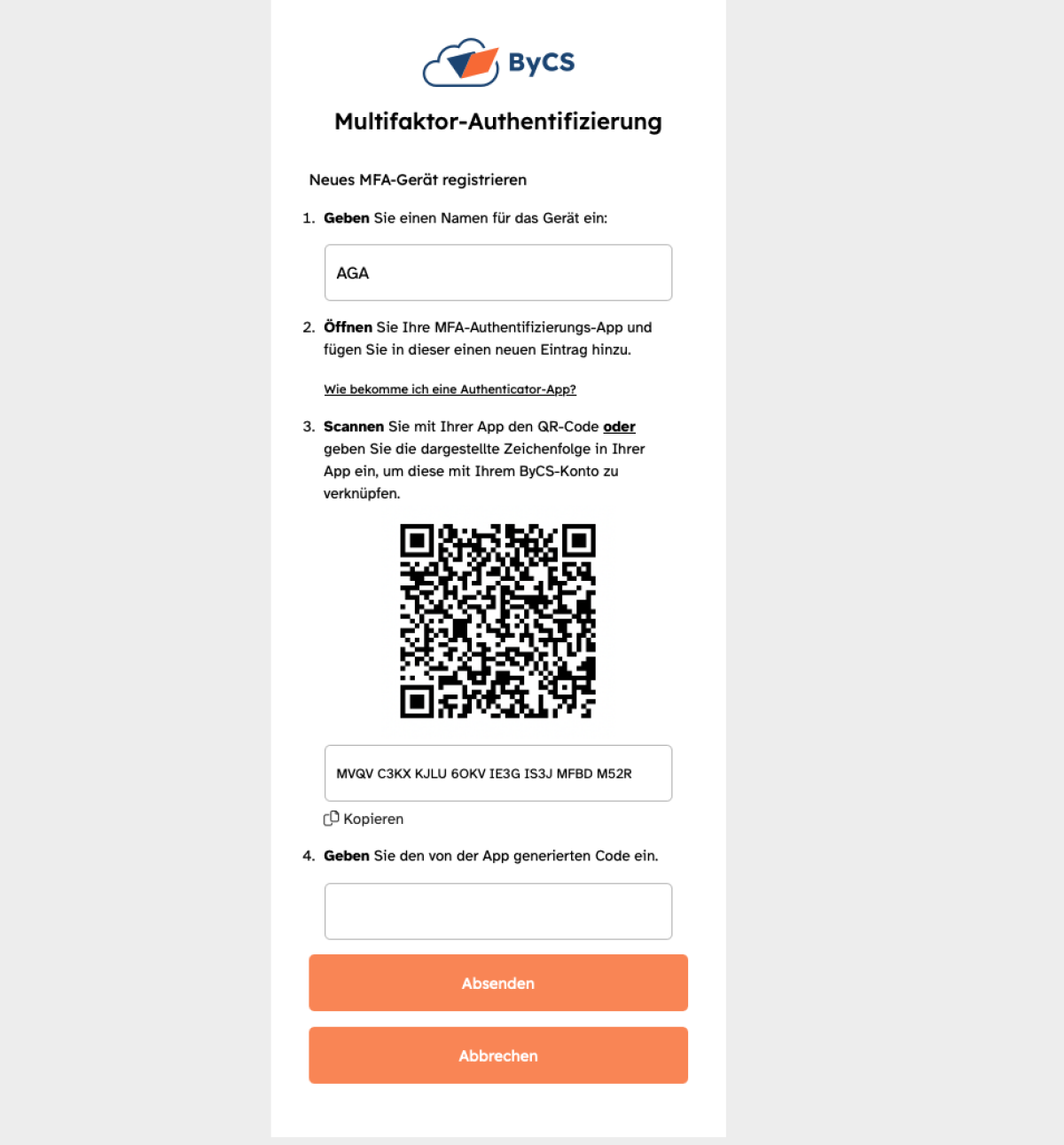 Geben Sie unter Punkt 1 dem neuen Gerät eine eindeutige Bezeichnung (z. B. Dienstgerät oder Smartphone). Diese wird Ihnen später unter registrierte Geräte angezeigt. Jetzt öffnen Sie die von Ihnen ausgewählte Authentifizierungs-App und fügen dort einen neuen Eintrag hinzu.