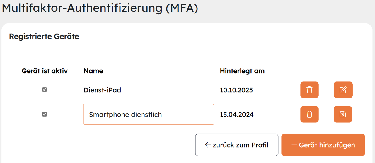 Hinweis: Die Umbenennung eines Geräts hat keine Auswirkung auf die Bezeichnung in Ihrer Authentifizierungs-App. Diese können Sie nur direkt in Ihrer App verändern.
