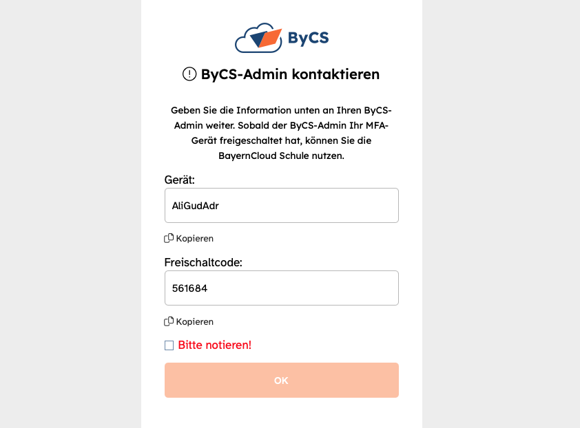 Notieren Sie sich den Gerätenamen und den angezeigten sechsstelligen Freischaltcode und geben Sie diese an Ihre ByCS-Administratoren weiter. Dann kann Ihr Gerät freigeschaltet werden.