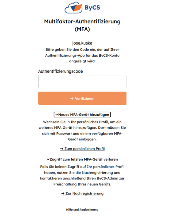 Hinweis: Sie können für die Multifaktor-Authentifizierung maximal drei Geräte registrieren. Sollten Sie diese Anzahl bereits erreicht und auf keines dieser Geräte Zugriff haben, dann wenden Sie sich an Ihre ByCS-Administration. In diesem Fall muss von dieser zunächst mindestens eines der Geräte entfernt werden.