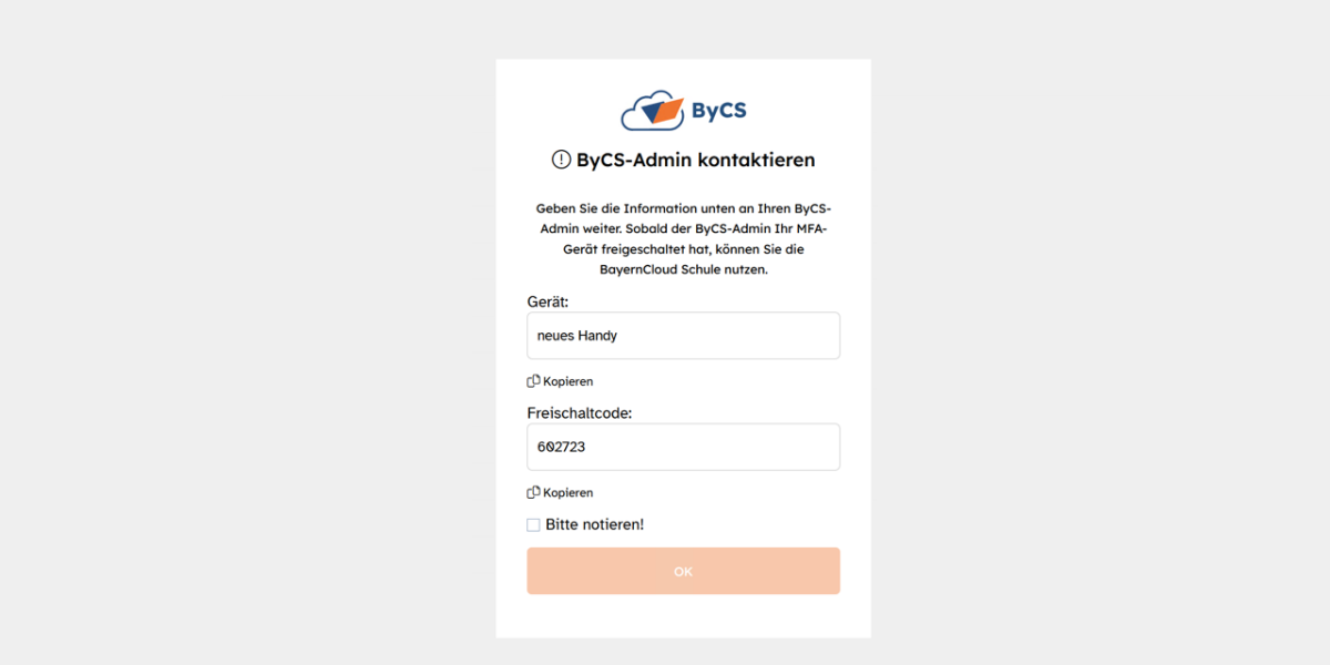 Bitte notieren Sie sich den nun angezeigten Gerätenamen und den angezeigten sechsstelligen Freischaltcode, um diese an Ihre ByCS-Administration weiterzugeben. Nur, wenn ihr diese Informationen vorliegen, kann sie das neue Gerät freischalten.