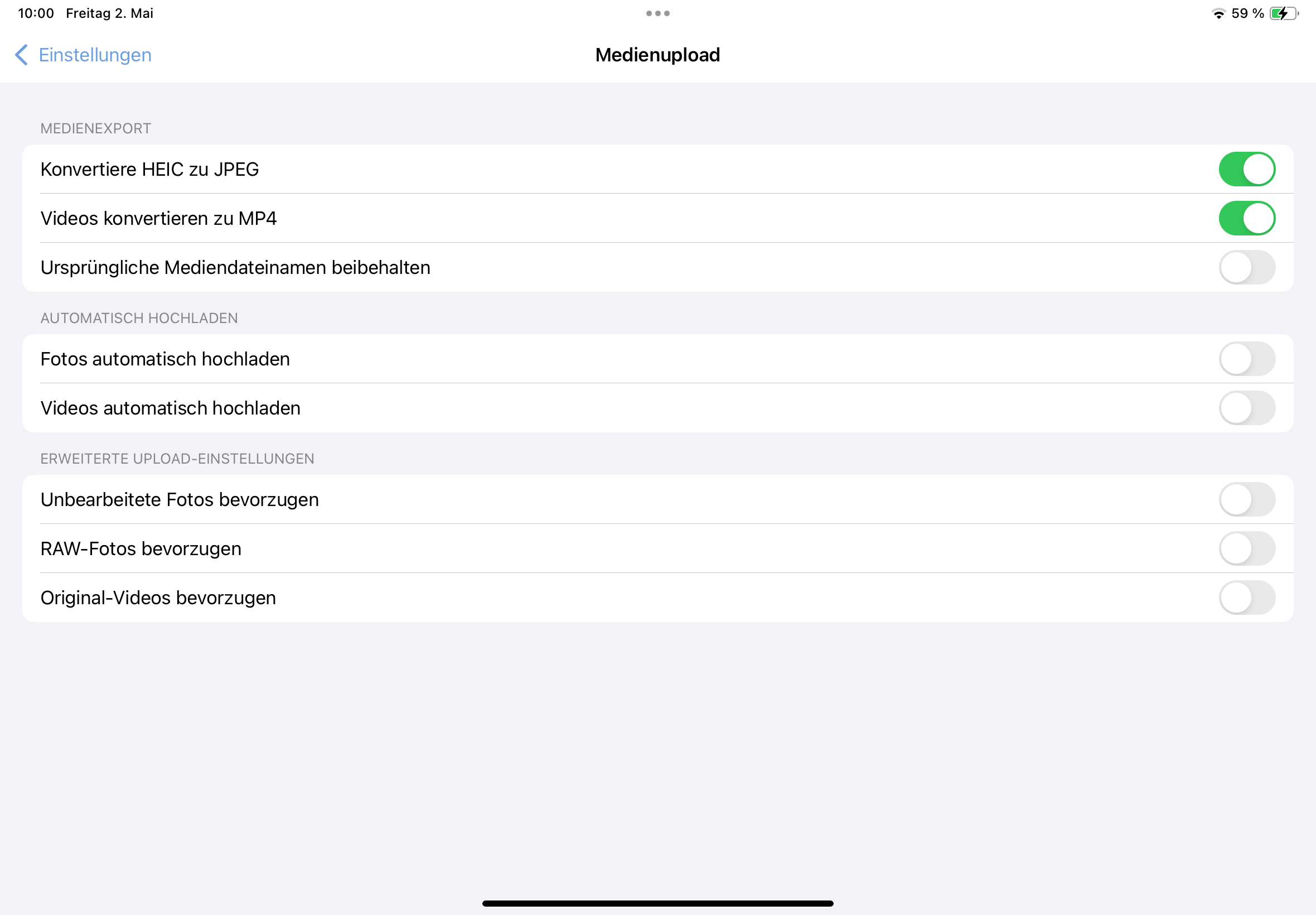Auch für den Medienupload kannst du individuelle Einstellungen vornehmen. Wir empfehlen dir jedoch, die Voreinstellungen zu belassen.
