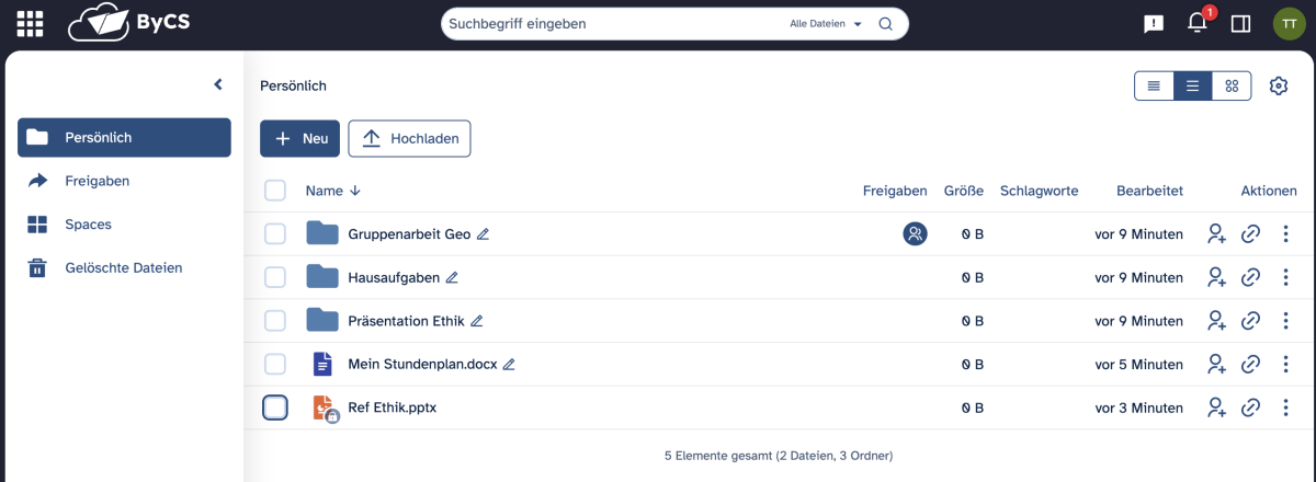 Du siehst nun alle Dateien und Ordner, die in deinem Persönlich(en) Bereich liegen. Dieser ist in der Seitenleiste farbig hinterlegt, was dir anzeigt, dass du diesen geöffnet hast. Dateien und Ordner in deinem persönlichen Bereich kannst zunächst nur du selbst öffnen oder bearbeiten. Du kannst diese aber auch für Mitschülerinnen und Mitschüler oder Lehrkräfte freigeben und diesen somit den Zugriff auf gewünschte Dateien erlauben. Wie das geht, erfährst du in einem gesonderten Tutorial.