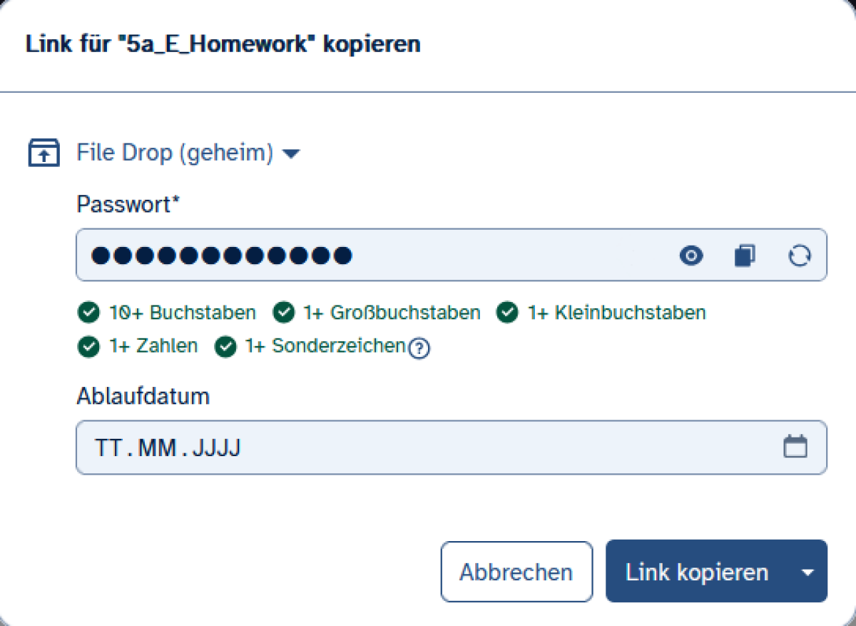 Sie können nun im Feld Passwort* ein Passwort vergeben oder das bereits erzeugte kopieren und Eingabefeld Ablaufdatum ein Ablaufdatum für den öffentlichen Link wählen. Es muss ein Passwort für den Link vergeben werden, das folgenden Kriterien entspricht: