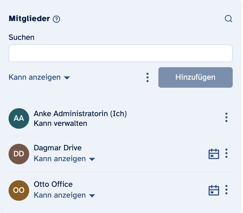 Erstellen Sie in Persönlich oder in einem Ihrer Spaces einen Ordner und benennen Sie diesen. Um anderen Personen diesen Ordner als File Drop zur Verfügung zu stellen, müssen Sie diesen nun mit Personen teilen. Gehen Sie Dazu in der Zeile des Ordners auf das 3-Punkte-Symbol am rechten Rand der Dateiliste und wählen Sie die Option Teilen. Alternativ klicken Sie auf das Teilen-Symbol am rechten Rand der Dateiliste.