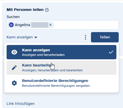 Unter Geteilt mit können die Berechtigungen für einzelne Personen und Gruppen durch Klick auf das Pfeil-Symbol unter dem Namen auch im Nachhinein geändert werden.