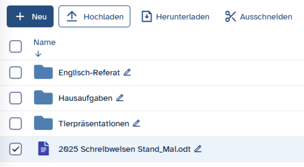 Um eine Datei oder einen Ordner umzubenennen, klicken Sie auf das vorhandene Stift-Symbol direkt neben dem Namen des gewünschten Objekts.