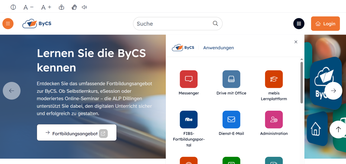 Gehe auf die Startseite der Bayern CloudSchule (www.bycs.de) und klicke neben dem Login-Symbol auf das Icon mit den neun Punkten (Bento-Menü). Klicke nun auf das Icon Drive mit Office. Anschließend meldest du dich mit deiner ByCS-Kennung an.
