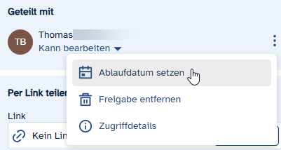 Klicke auf das 3-Punkte-Symbol bei den Personen oder Gruppen, deren Zugriff du zeitlich begrenzen möchtest. Klicke im sich öffnenden Menü auf Ablaufdatum setzen und im erscheinenden Kalender auf den gewünschten Tag. Mit Ablauf des gewählten Tags erlischt dann die Zugriffsberechtigung der Personen oder Gruppen auf deine Datei oder deinen Ordner.
