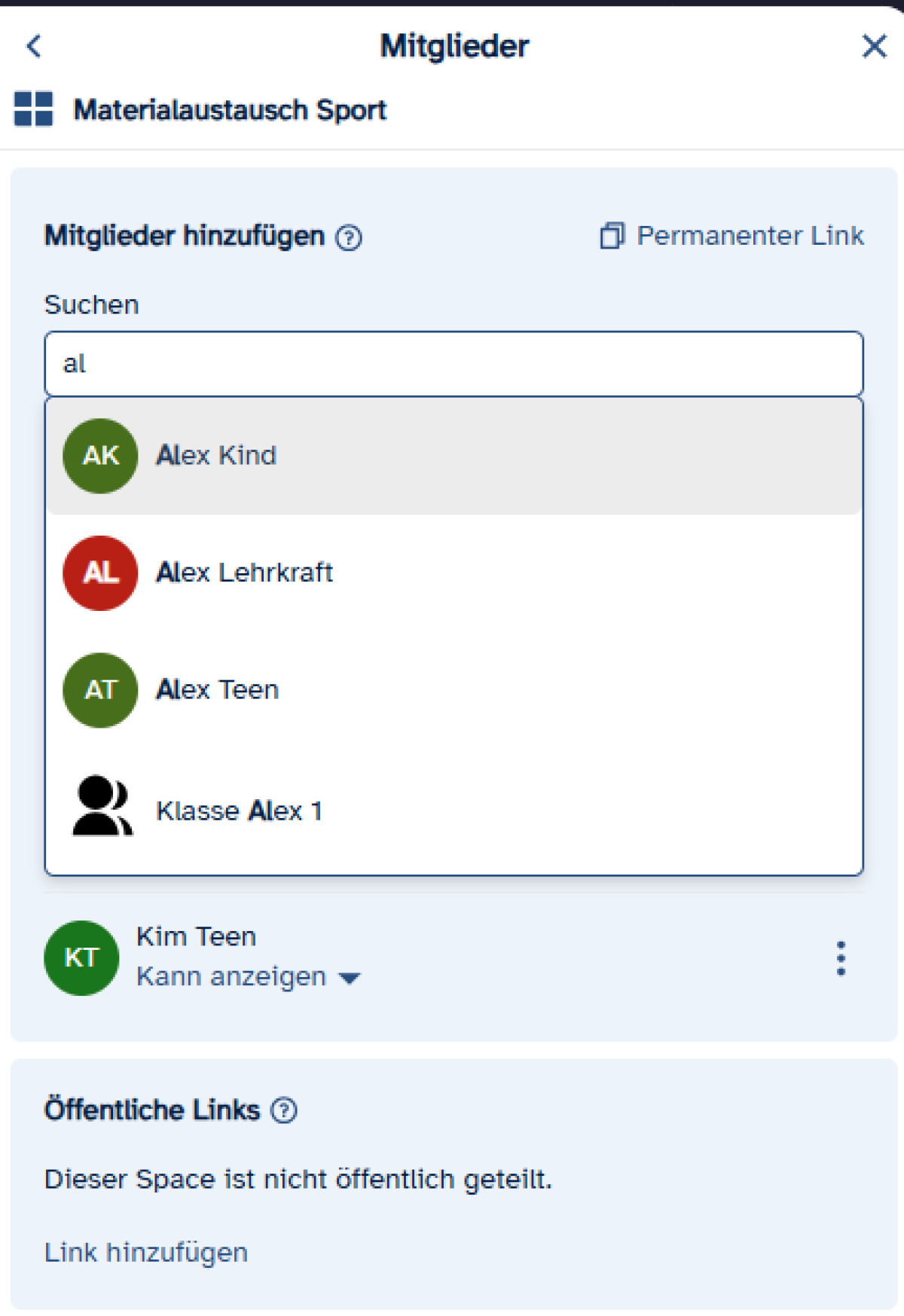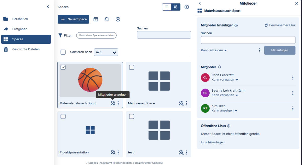Ein Space kann sowohl mit Mitgliedern der eigenen Institution (z. B. Schule) als auch mit Externen geteilt werden. Im Folgenden zeigen wir Ihnen die beiden unterschiedlichen Vorgehensweisen: