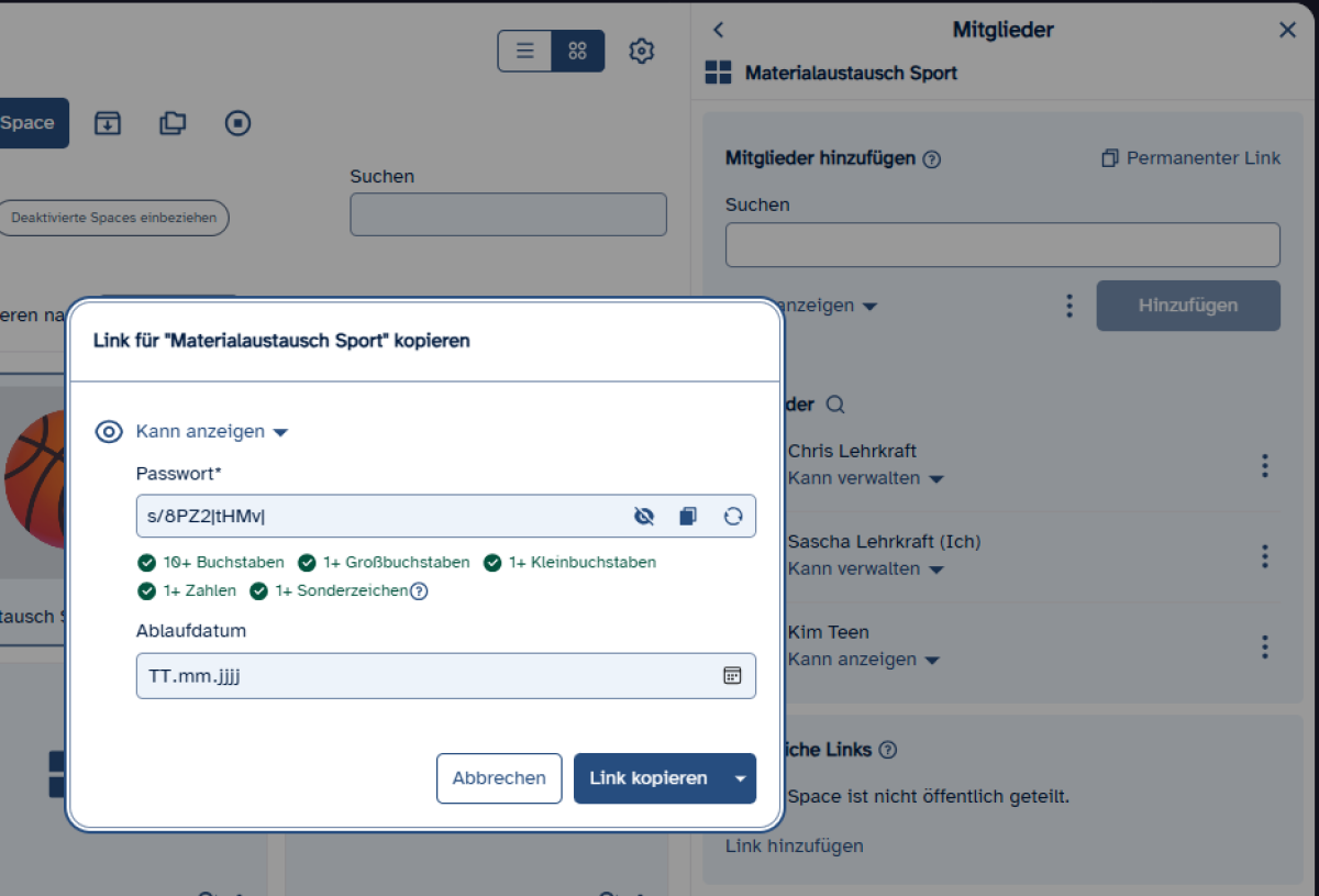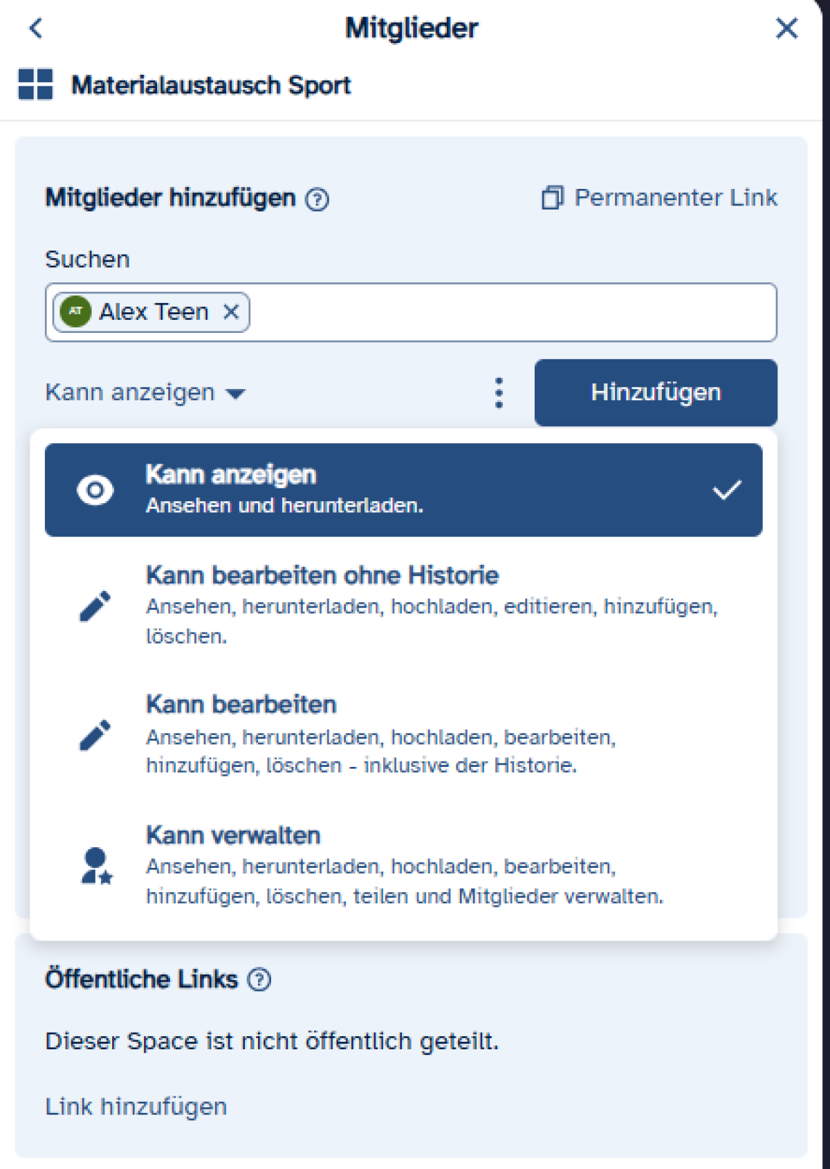 Gehen Sie im Mitgliederfeld unter Öffentliche Links auf Link hinzufügen. Es erscheint ein Fenster, um die Berechtigungen, ein Passwort und ein optionales Ablaufdatum festzulegen.