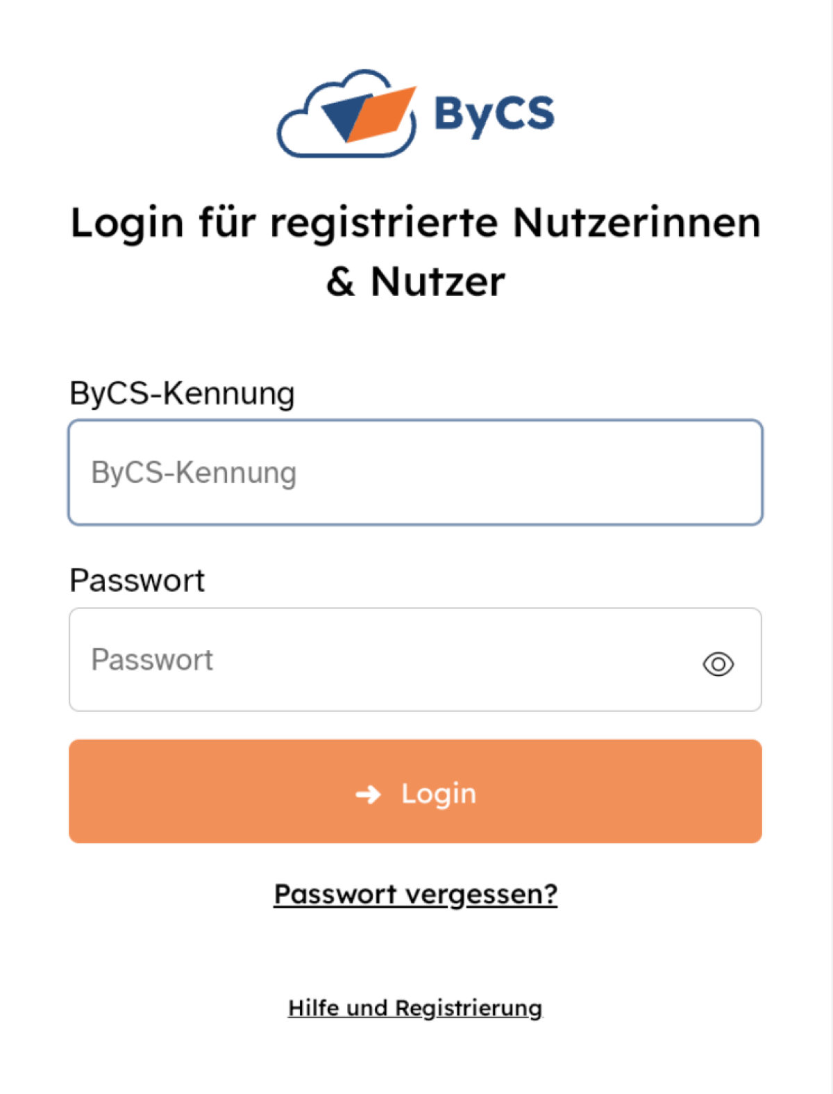 Es öffnet sich nun die ByCS-Anmeldemaske. Loggen Sie sich mit Ihren Benutzerdaten ein und bestätigen Sie mit Login.