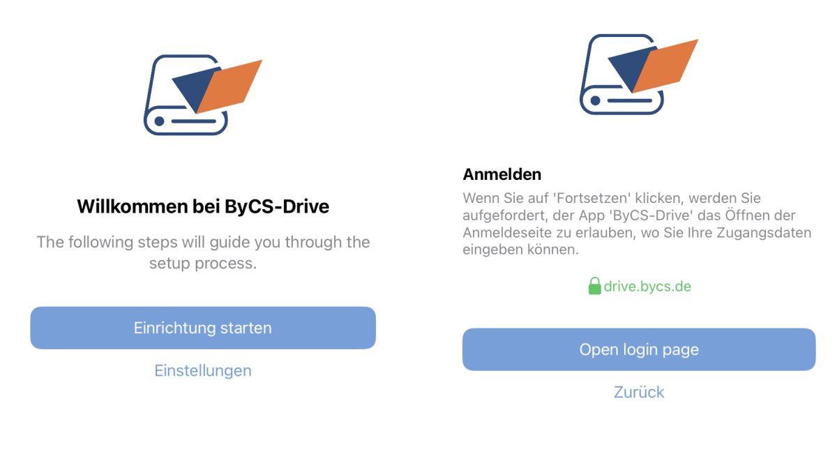 In der darauf folgenden Ansicht wird die Server-URL https://drive.bycs.de/ angezeigt. Klicken Sie auf Open login page.