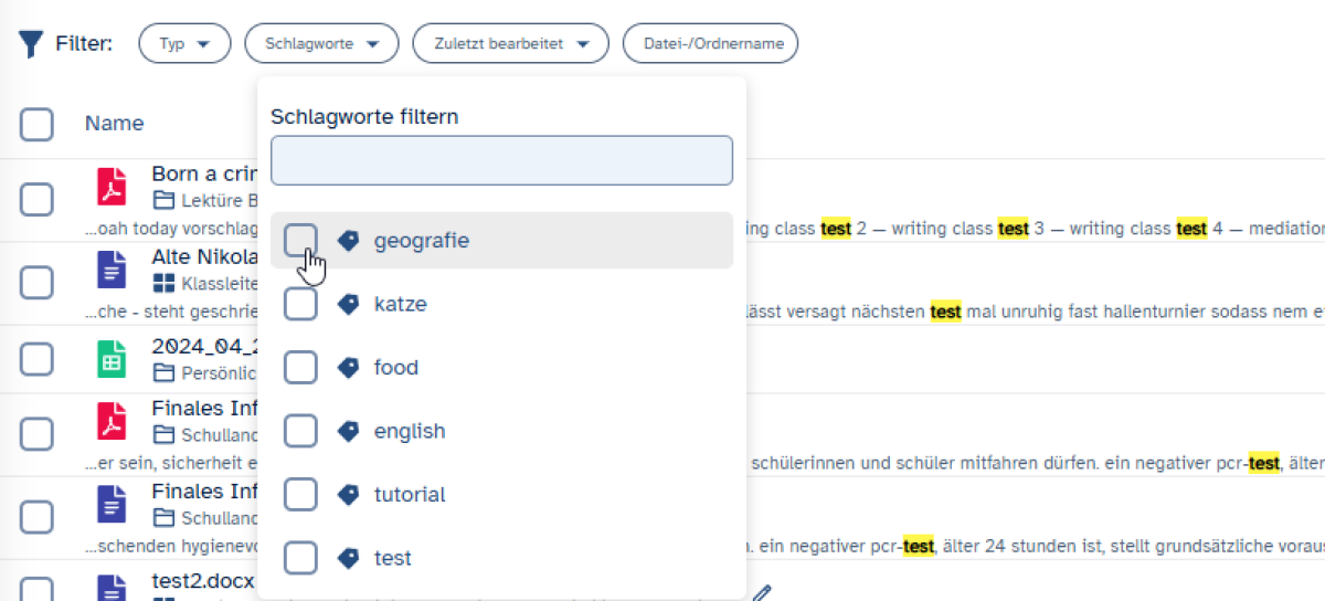 Schlagworte können unter anderem verwendet werden, um Dateien bestimmten Themen zuzuordnen oder gezielt danach zu suchen. Sie finden diese in der Dateiübersicht in Persönlich oder in einem Ihrer gewählten Spaces angezeigt.