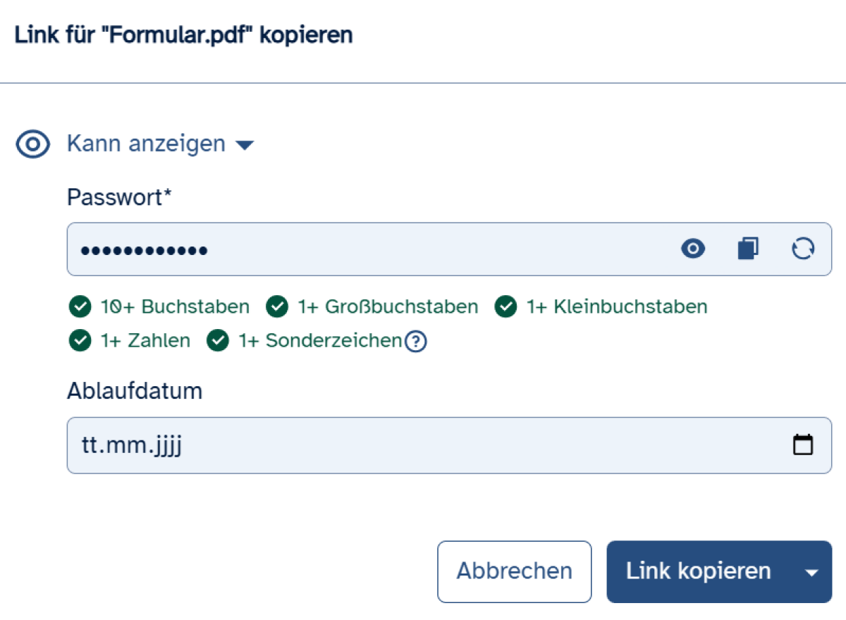 Ein öffentlicher Freigabelink erfordert ein Passwort, das bestimmte Sicherheitskriterien erfüllen muss. Es wird zunächst ein automatisch generiertes Passwort vorgeschlagen. Sie können dieses aber auch durch ein eigenes Passwort ersetzen. Die Sicherheitskriterien werden dann unter der Eingabemaske zur Passworterstellung zunächst rot gelistet und bei Erfüllung grün angezeigt.