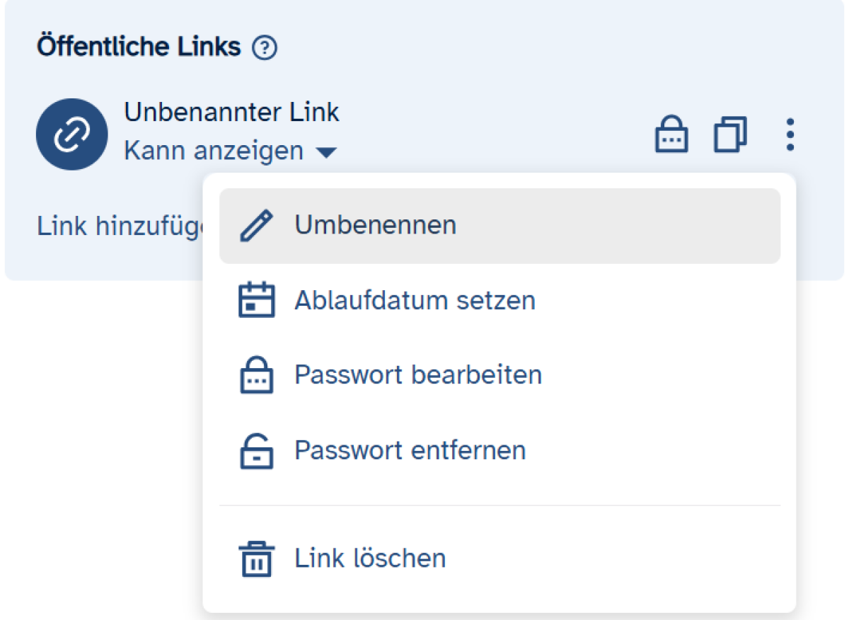 - Link löschen: Entfernen Sie den erstellten Link. Er erscheint nicht mehr in der Übersicht Ihrer Linkfreigaben und Personen, die ihn erhalten haben, können damit nicht mehr auf den Inhalt zugreifen. Dies ist nur möglich, wenn lediglich die Berechtigung zum Anzeigen der Datei vergeben wurde.