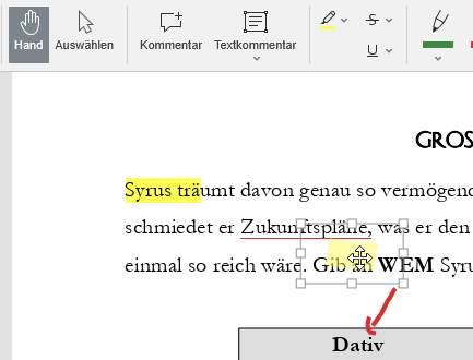 Klicken Sie dann auf das Hand- oder Pfeilsymbol in der Menüleiste und dann auf Ihr Textfeld, um es über die Anfasser auf die gewünschte Größe zu bringen oder an eine andere Stelle im Dokument zu bewegen.