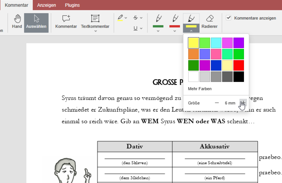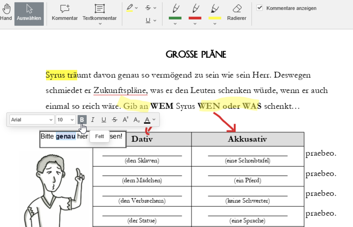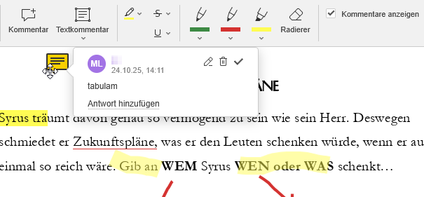 Kommentare sind im Gegensatz zu Textkommentaren nur dann sichtbar, wenn man aktiv darauf klickt. Auf diese Weise lassen sich beispielsweise Lösungen zu einzelnen Aufgaben oder Lernhilfen auf dem Dokument verbergen. Das schafft Übersicht und bietet die Möglichkeit, im Unterricht zu differenzieren.