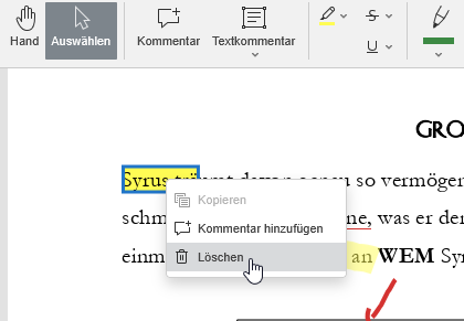 Klicken Sie dafür auf das Hand- bzw. Pfeilsymbol. Markieren Sie mit einem Rechtsklick die Anmerkung, die Sie entfernen möchten.