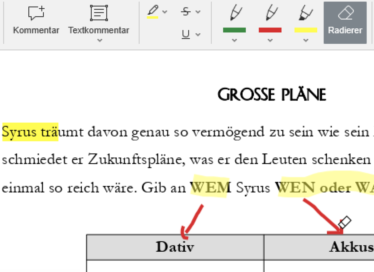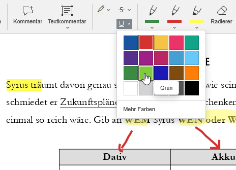 Für handschriftliche Anmerkungen nutzen Sie einen der drei vorausgewählten Stifttypen. Zur Wahl stehen ein grüner und ein roter Stift sowie ein gelber Textmarker.