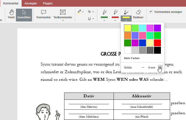 Für ein steteres Erscheinungsbild nutzen Sie die Markierungsfunktionen in der Menüleiste. Mit Maus und Stift lassen sich hiermit Elemente in der PDF-Datei farblich hervorheben, unterstreichen oder durchstreichen.