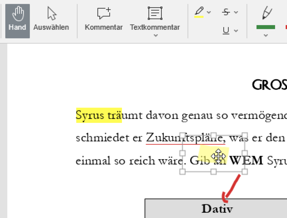 Handschriftliche Notizen lassen sich direkt im PDF-Dokument verschieben. Klicken Sie hierzu auf das Hand-Symbol bzw. Pfeil-Symbol in der Menüleiste und anschließend auf das Element im Dokument, das Sie verschieben möchten.