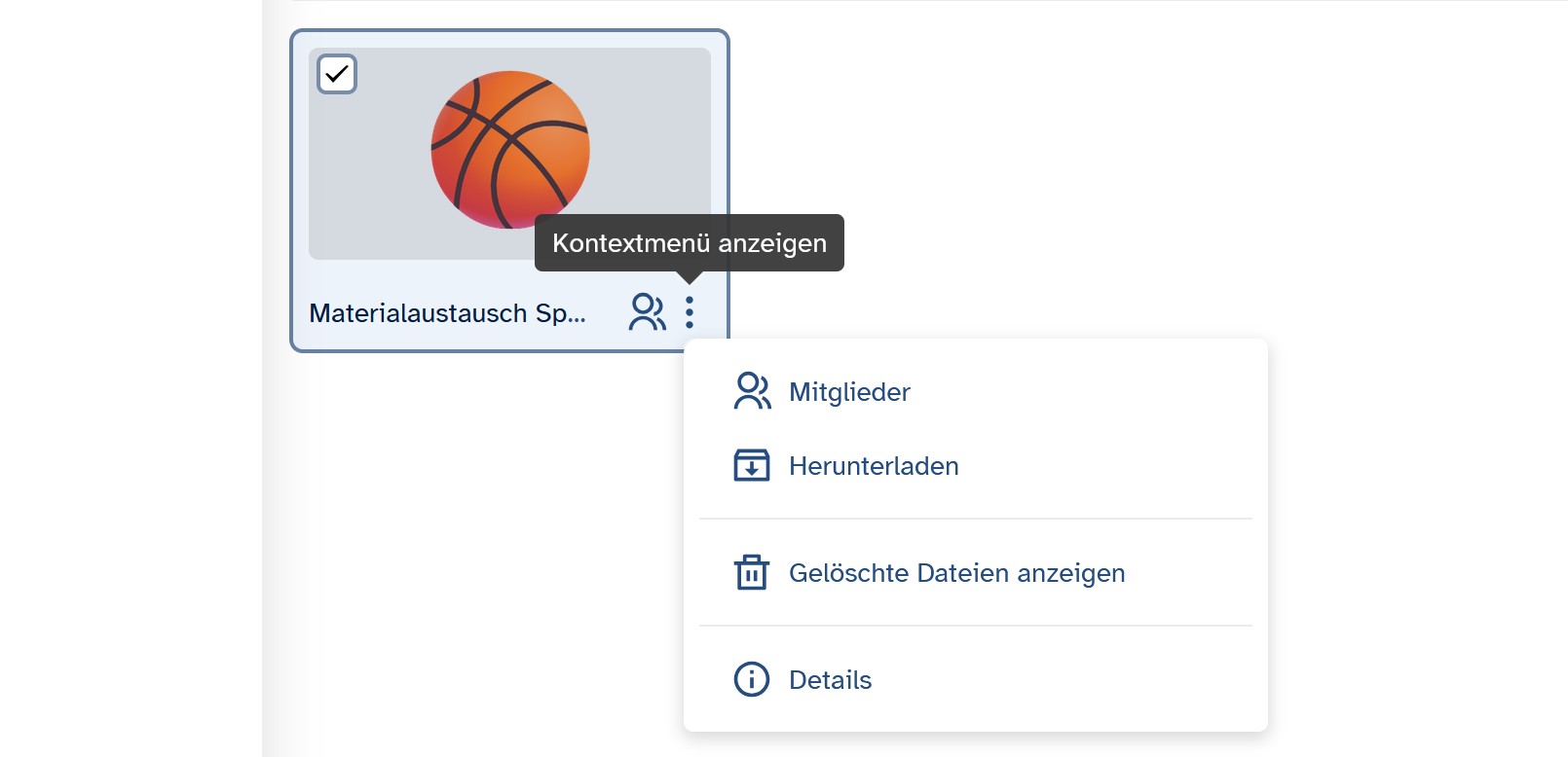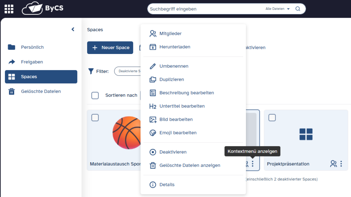 Öffnen Sie zunächst über das Seiten-Menü die Spaces-Übersicht. Klicken Sie in der Kachel des zu bearbeitenden Space auf das 3-Punkte-Symbol.
