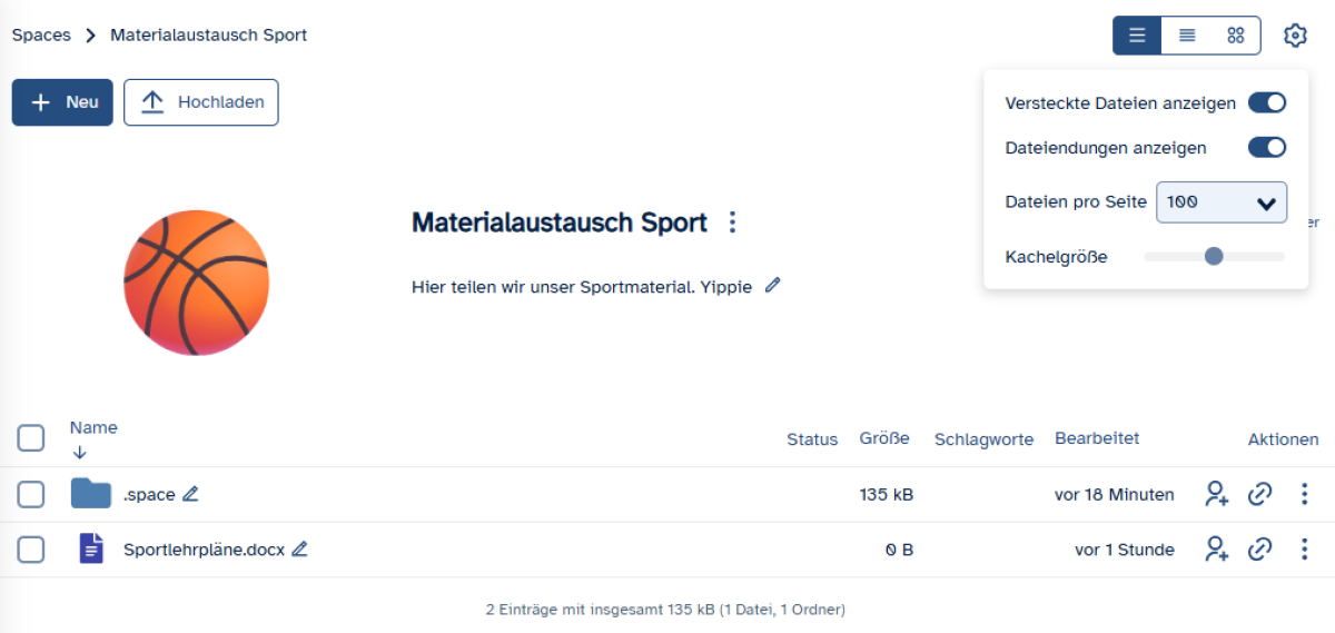 Öffnen Sie dazu den Space und gehen Sie klicken Sie in der Aktionsleiste auf das Zahnrad-Symbol. Setzen Sie hier den Schieberegler auf Versteckte Dateien anzeigen.