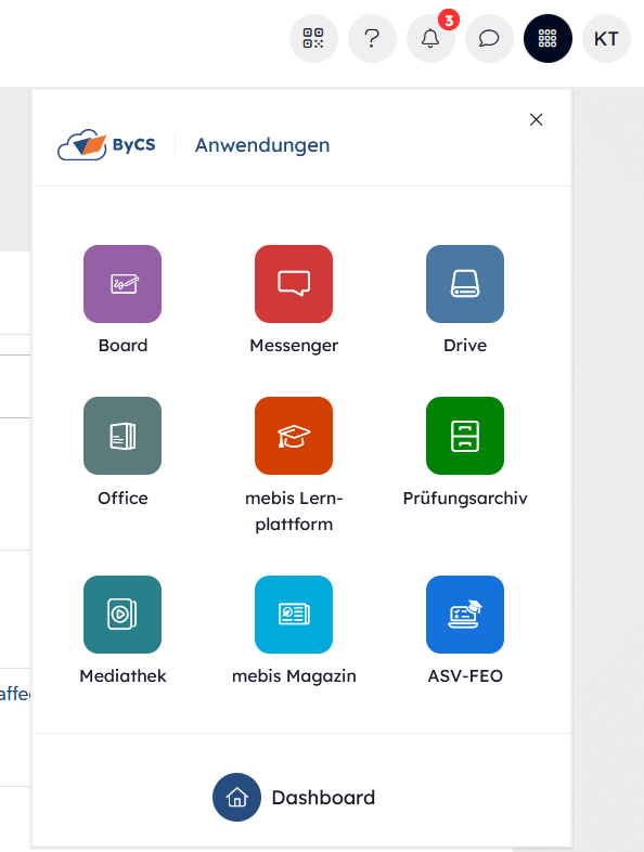 - Du bist bereits eingeloggt und befindest dich in einer Anwendung der BayernCloud Schule. Um auf das Dashboard zu gelangen, klicke auf das Bento-Menü. Es erscheint eine eingeschränkte Übersicht über deine Anwendungen. Klicke auf den Home-Button Dashboard, um auf dein Dashboard zu gelangen.