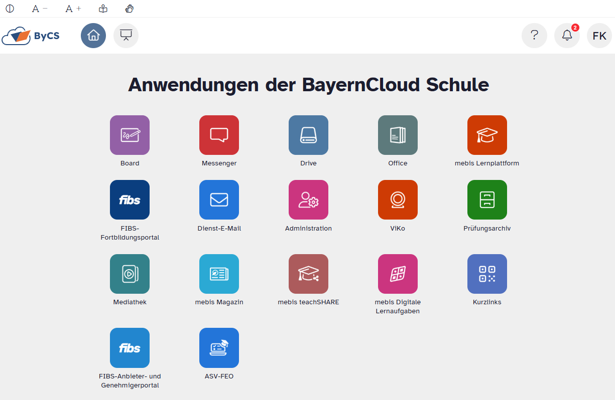 - Über das Glocken-Symbol erreichen Sie Ihre persönliche Mitteilungszentrale. An dieser Stelle finden Sie nach Themenbereichen sortiert Nachrichten Ihrer Schule, der einzelnen Anwendungen, Informationen zu medienpädagogischen Inhalten und Fortbildungsangeboten sowie Neuigkeiten rund um Ihre BayernCloud Schule. Ob Mitteilungen für Sie vorliegen, können Sie an dem Indikator beim Glocken-Symbol erkennen. Der Indikator gibt auch die Anzahl neuer Mitteilungen an.