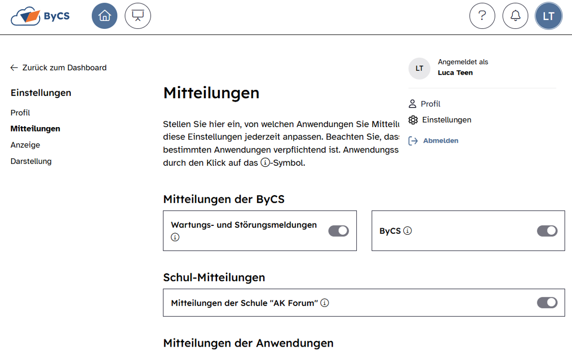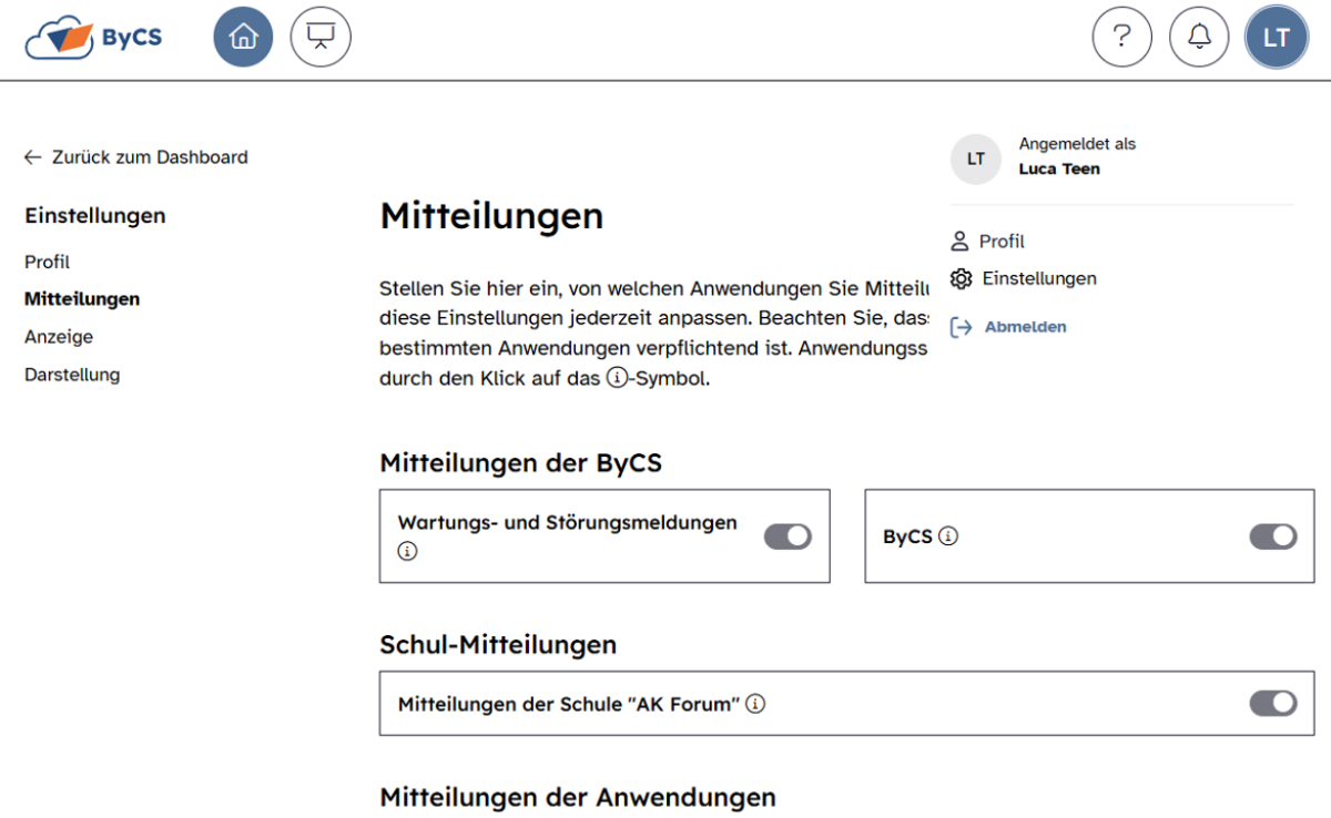 Du befindest dich auf dem Dashboard der BayernCloud Schule und möchtest Einstellungen für deine Mitteilungszentrale oder zur Darstellung des Dashboards vornehmen. Wir zeigen dir, welche Möglichkeiten dir dazu zur Verfügung stehen.