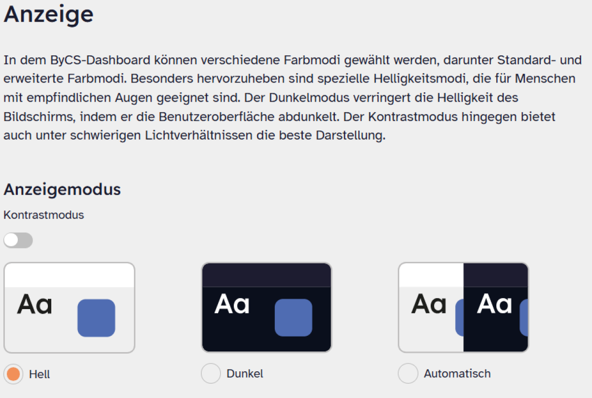 - welcher Anzeige-Modus (Dark- oder Light-Mode) aktiviert wird, wenn du in ByCS arbeitest,