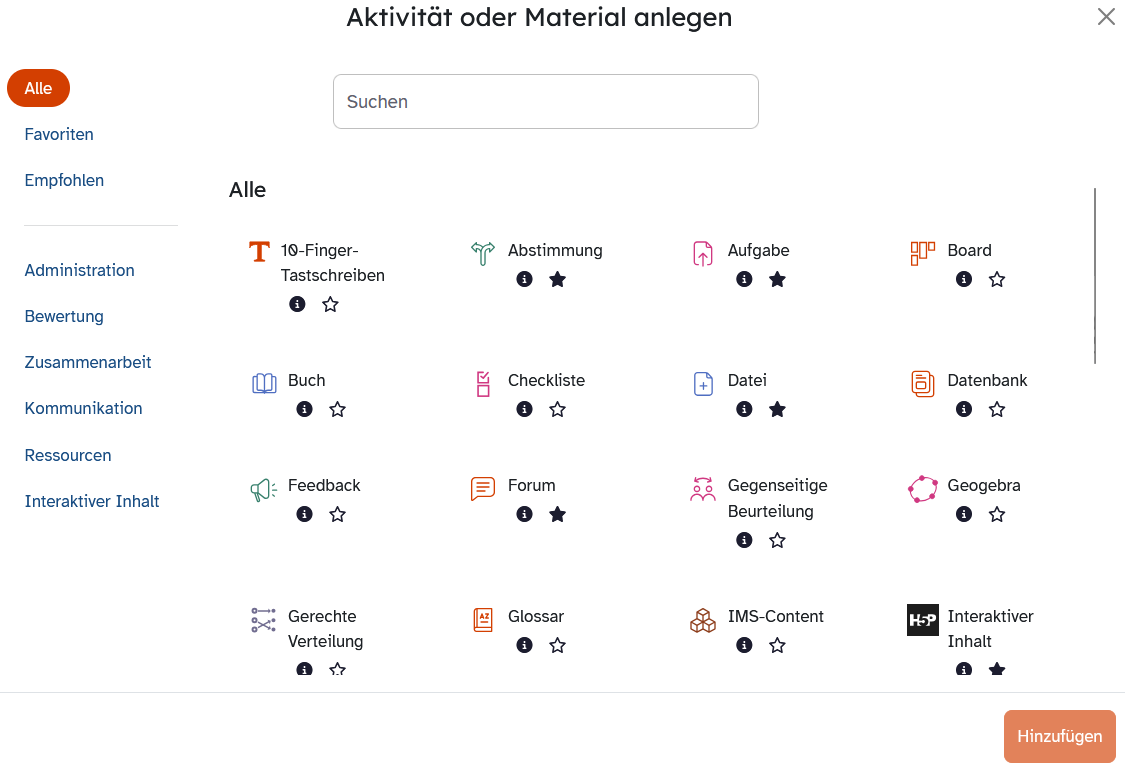 Suchen Sie dort über das Suchfeld oder den passenden Anwendungsbereich die gewünschte Aktivität aus und legen Sie diese entweder über einen Doppelklick oder einen Klick auf Hinzufügen in Ihrem Kurs an.