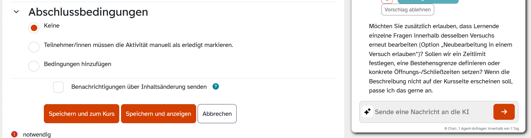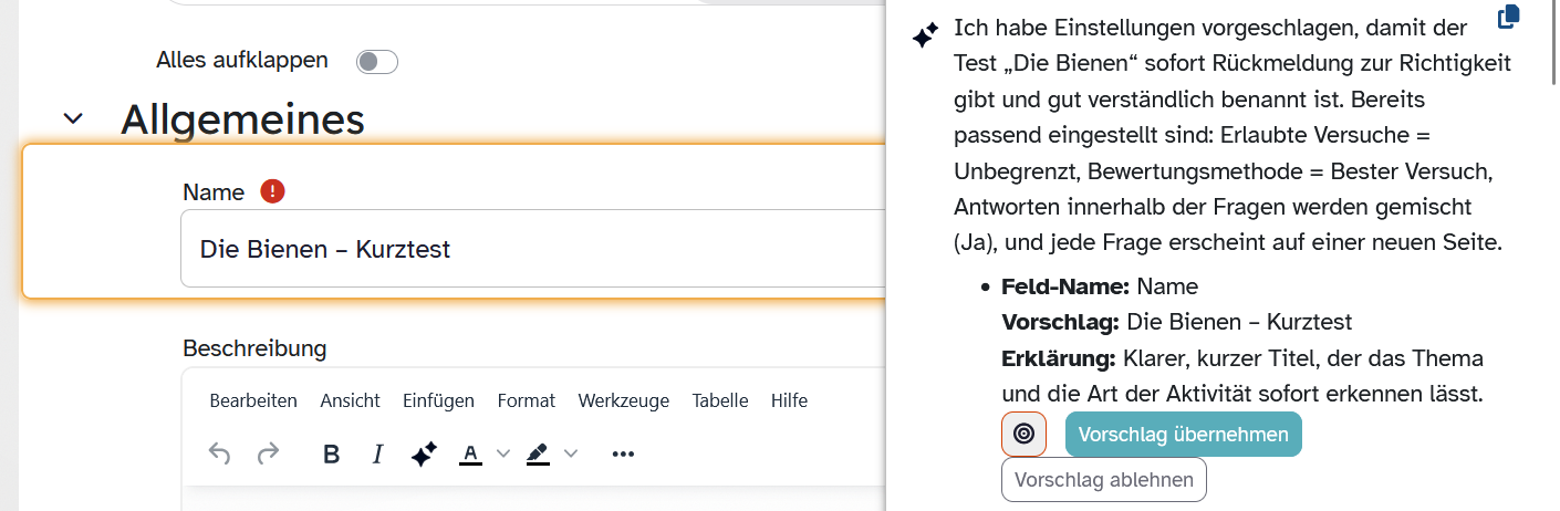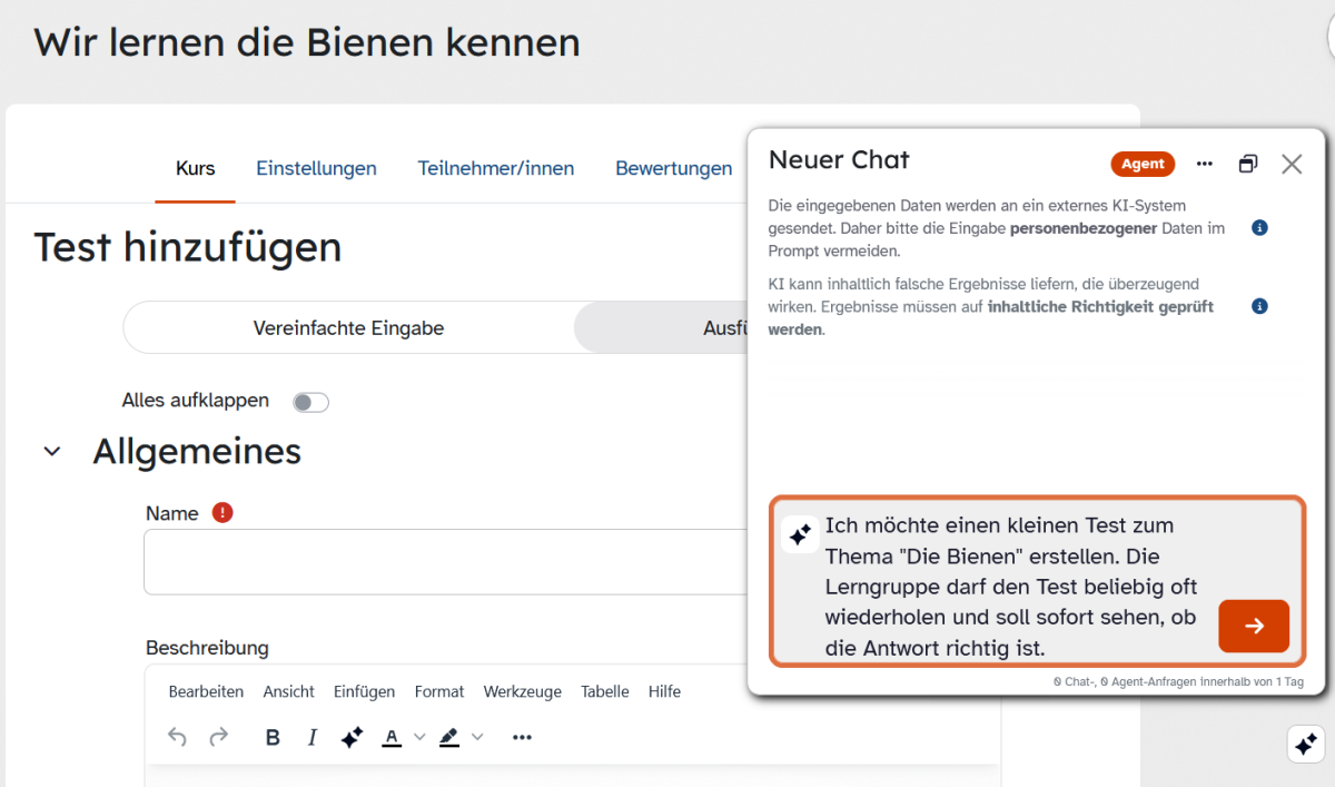 Sie benötigen beispielsweise Hilfe beim Anlegen einer Aktivität oder für die Kurseinstellungen? Der Agent hilft Ihnen beim Ausfüllen des Formulars. Erfahren Sie hier, wie Sie diesen verwenden.