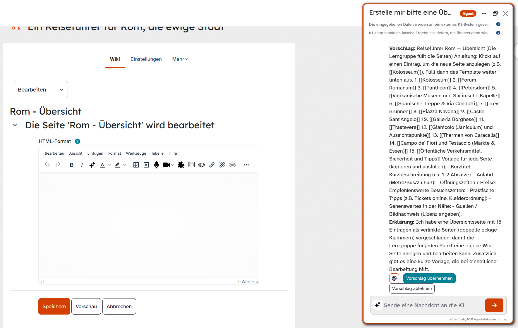 Viele Aktiväten der Lernplattform haben ganz bestimmte Anforderungen an die Formatierung. Der Agent hilft Ihnen dabei, Inhalte jeweils passgenau zu erstellen.