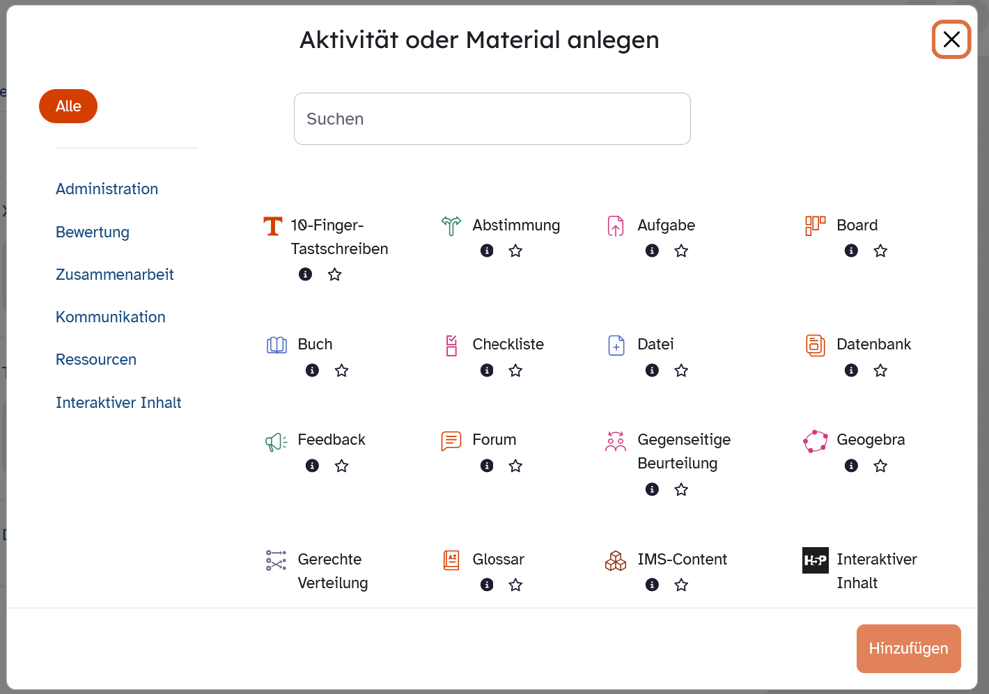 Klicken Sie an der gewünschten Stelle in Ihrem Kurs auf das Plus-Symbol und dann auf Aktivität oder Material und wählen Sie die Aktivität aus, die Sie anlegen möchten. Scrollen Sie dazu unter Alle nach unten oder nutzen Sie das Suchfeld.