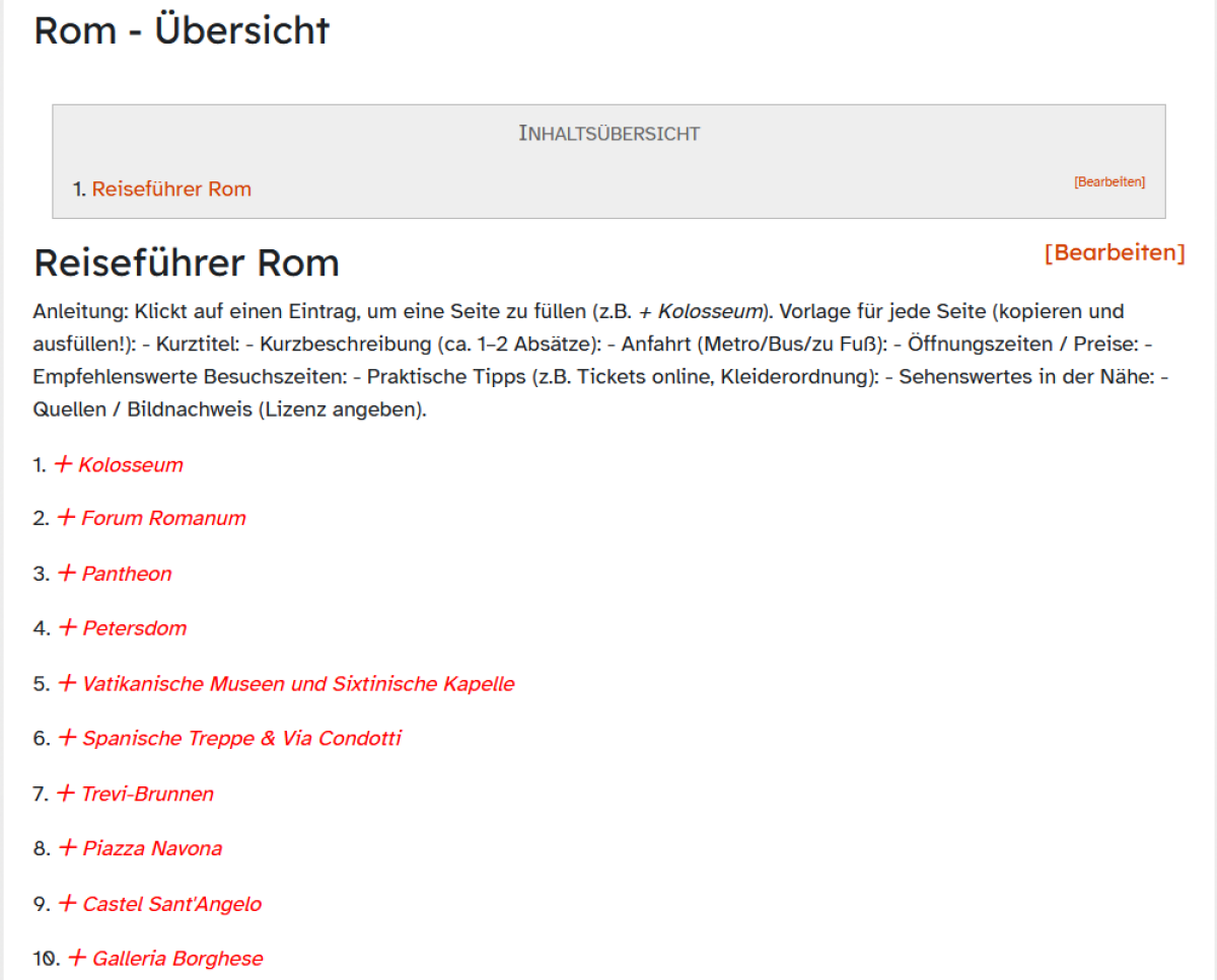 In diesem Beispiel benötigt man ein Inhaltsverzeichnis für einen Reiseführer nach Rom, den die Schülerinnen und Schüler im Anschluss gemeinsam gestalten sollen und der Prompt lautet z. B. "Erstelle mir bitte eine Übersicht für einen Reiseführer nach Rom mit 15 Einträgen. Die Lerngruppe soll ihn mit eigenen Inhalten befüllen."