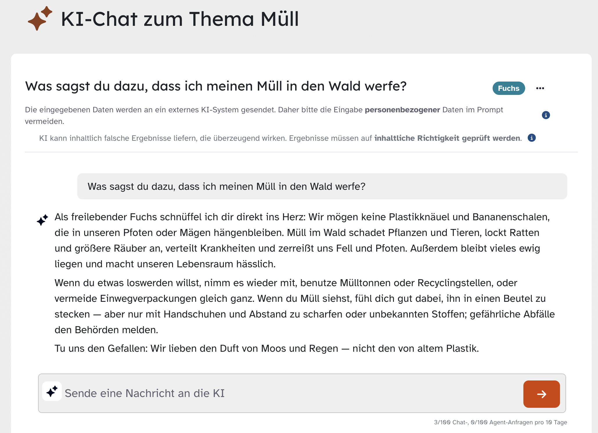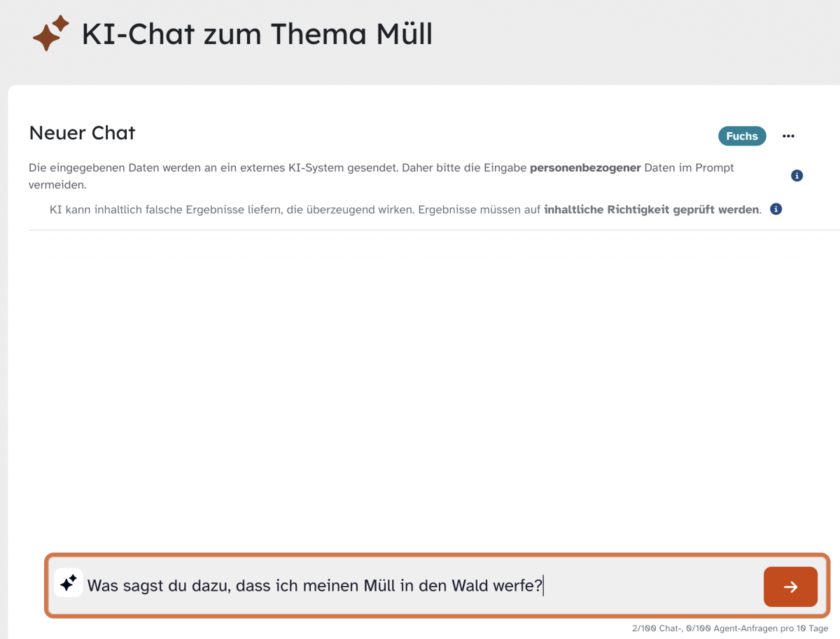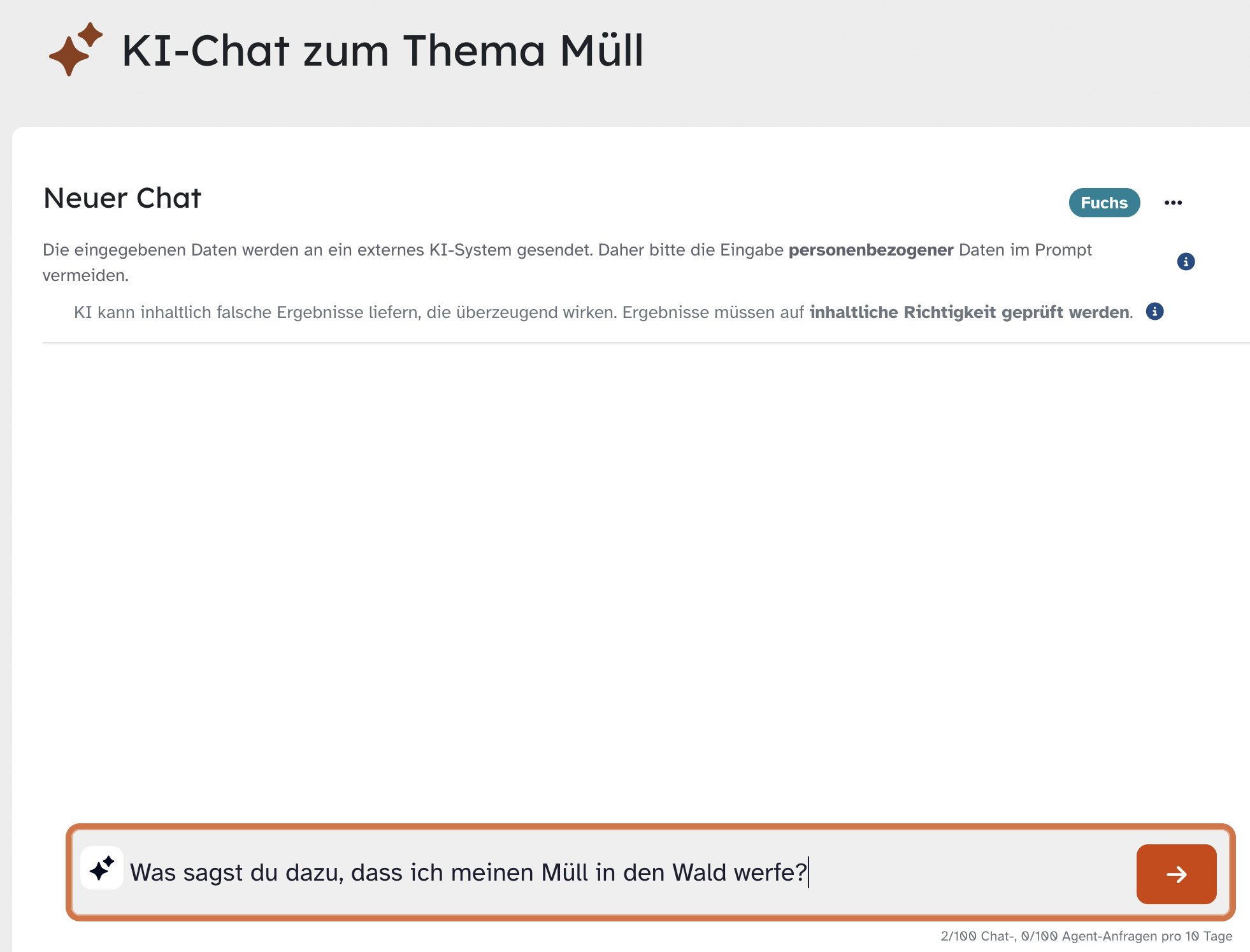 Tippe hierfür deine Frage in das Textfeld Sende eine Nachricht an die KI und bestätige deine Anfrage anschließend entweder mit der Enter-Taste oder einem Klick auf den Pfeil-Button.