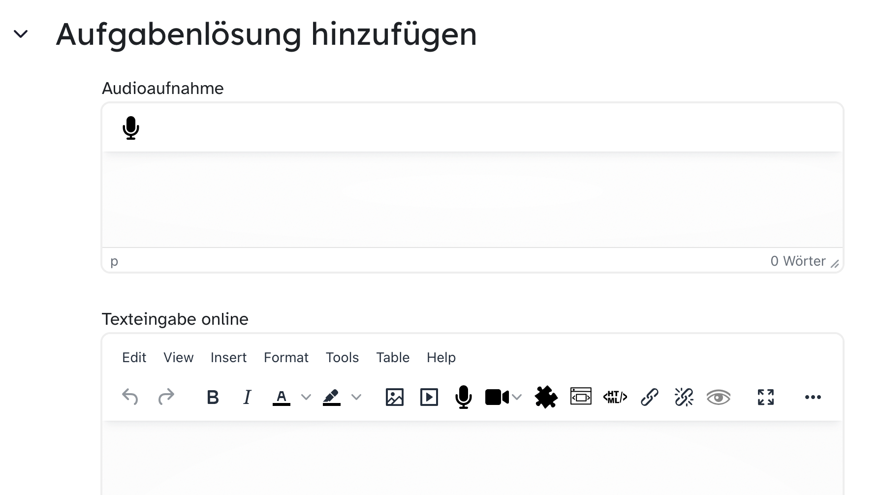 Sobald Sie den Button auswählen, erscheint eine neue Seite. Je nachdem, was Ihre Lehrkraft eingestellt hat, haben Sie nun bis zu drei Möglichkeiten, die Aufgabe zu bearbeiten (Audioaufnahme, Dateiabgabe, Texteingabe online).