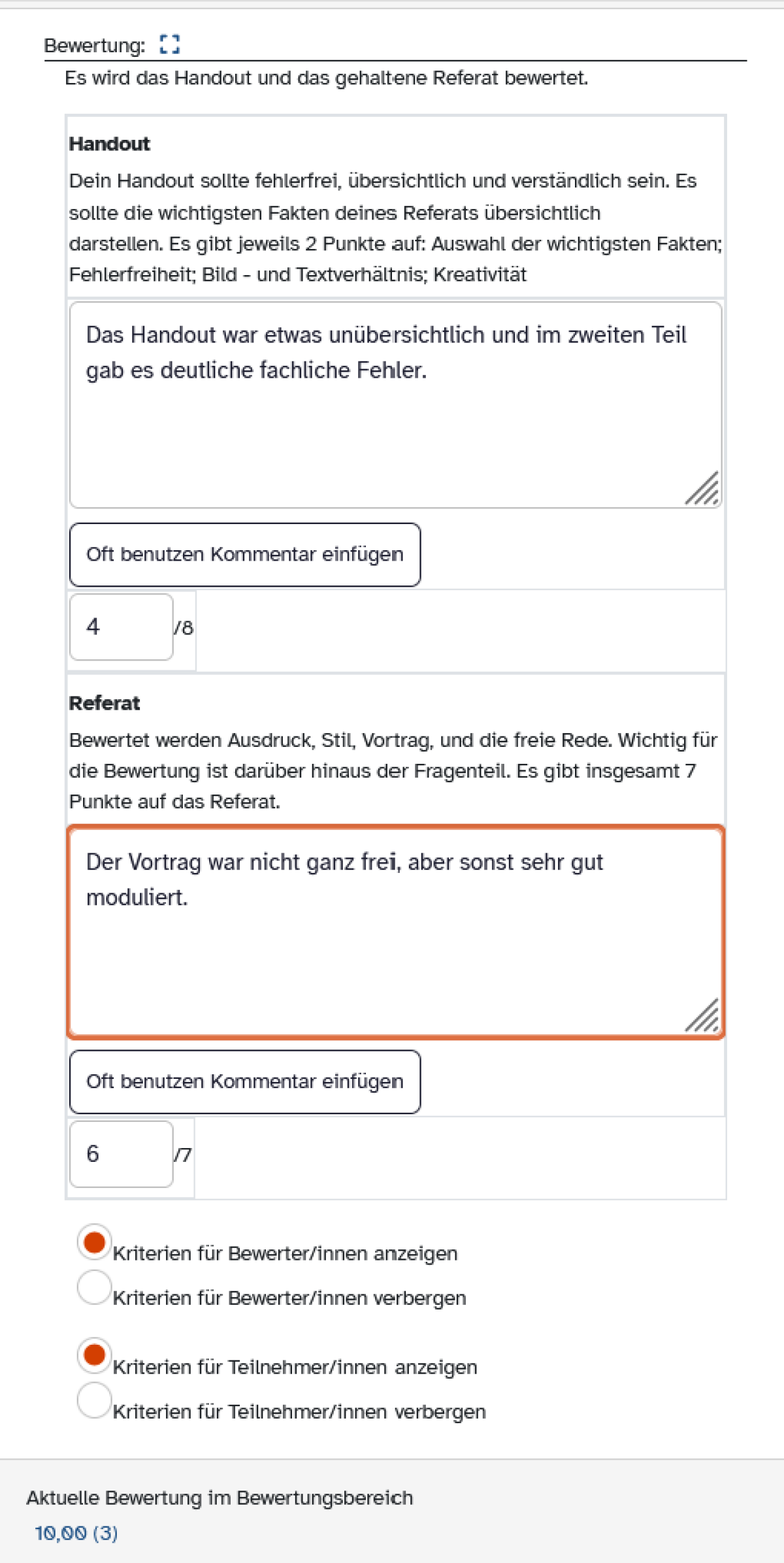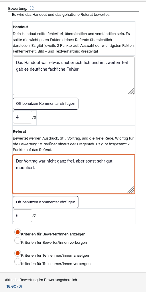 Nach der Abgabe der Arbeiten korrigieren Sie diese wie gewohnt, etwa indem Sie die Abgaben herunterladen oder die erweiterte Bewertungsseite verwenden. Für die Beurteilung der Leistungen greifen Sie auf Ihre Bewertungstabelle (Rubrik) zurück.