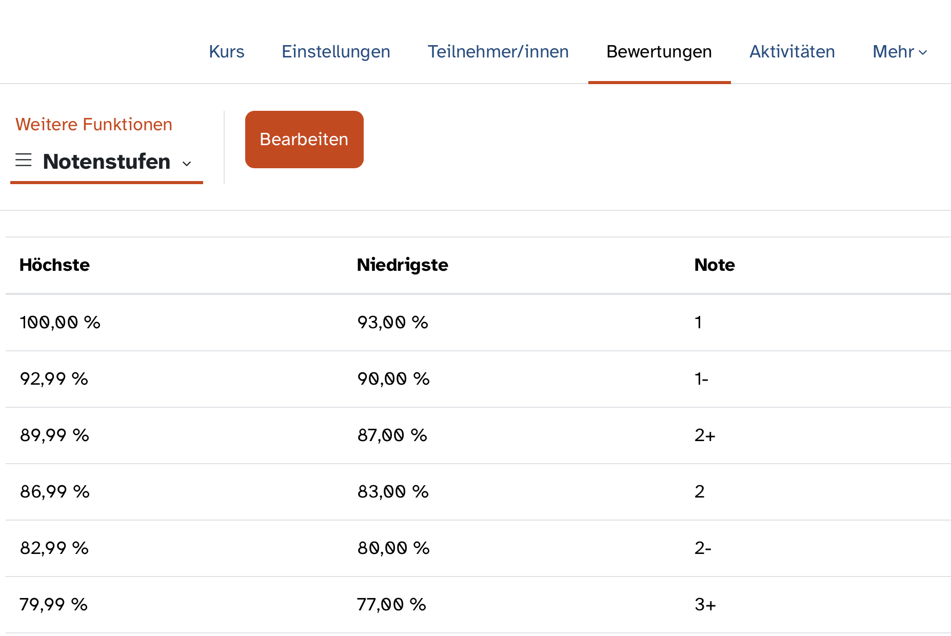 Um neben den erreichten Punkten den Schülerinnen und Schülern auch eine sofortige Mitteilung über die erhaltene Note zu senden, wechseln Sie im Kursraum in der sekundären Navigationsleiste auf Bewertungen. Im tertiären Drop-down-Menü finden Sie die Option Notenstufen. Hier passen Sie den Notenschlüssel nach Ihren Wünschen an. Klicken Sie hierzu auf Bearbeiten. Die eingestellten Notenstufen gelten für den gesamten Kursraum.