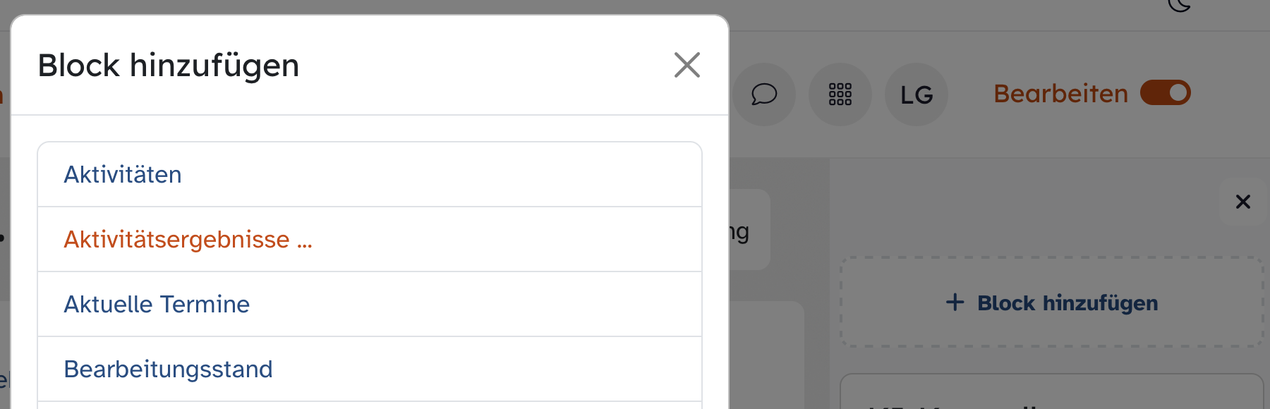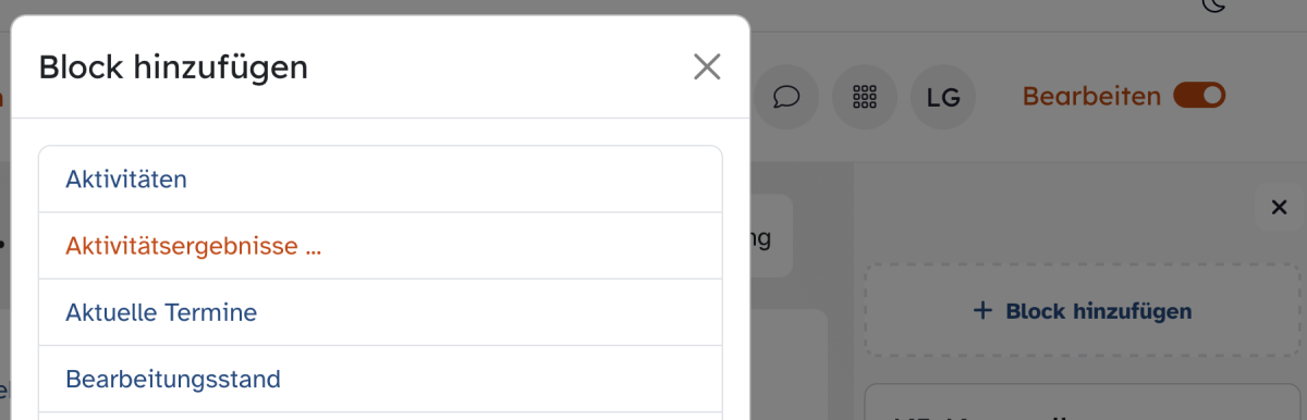 Wählen Sie Aktivitätsergebnisse..., um die Einstellungsoptionen für Ihren neuen Block aufzurufen und diesen anschließend anzulegen.